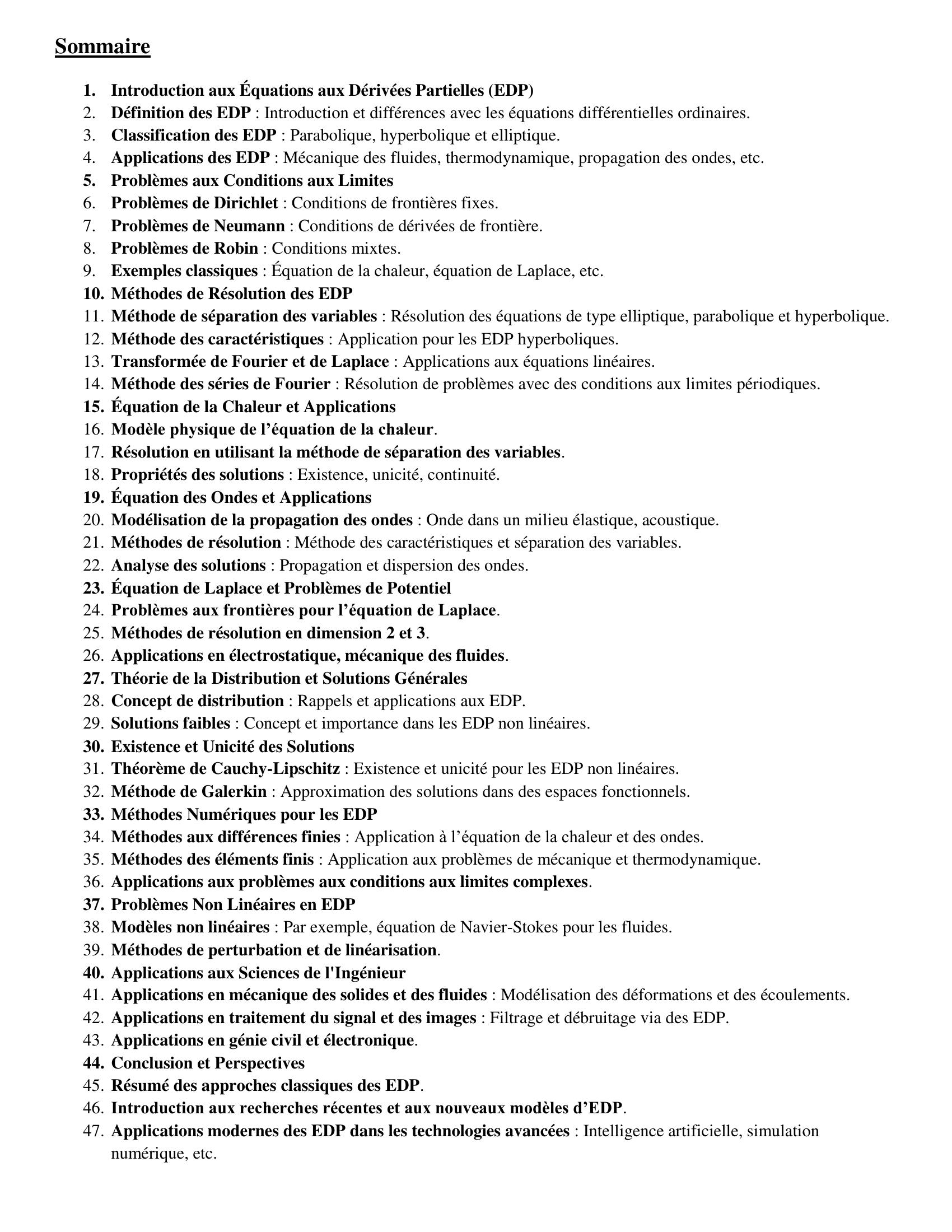 Ce cours d'analyse est consacré à l'exposition d'un certain nombre de thèmes classiques en théorie des équations aux dérivées partielles et il s'adresse à des étudiants de master, des élèves en écoles d'ingénieurs ou à tous ceux qui désirent connaître cette partie importante des mathématiques. Ce travail part du théorème d'Existence et d'Unicité pour les solutions d'équations différentielles non-linéaires, aborde la résolution des équations scalaires linéaires du 1er ordre (la méthode employée est celle des courbes caractéristiques) et s'intéresse ensuite aux équations scalaires quasi-linéaires. La transformation de Fourier, présentée au chapitre 6, est très importante car elle permet de résoudre les équations à coefficients constants de la formeP(u) = F où P est un opérateur différentiel en (t, x). Les équations des ondes, de la chaleur et de Schrödinger sont toutes de ce type et font l'objet d'une résolution très détaillée au moyen de formules explicites. À la fin, on quitte le domaine des équations à coefficients constants pour celui des équations à coefficients variables. Les méthodes employées pour résoudre ces équations donnent lieu à des développements très importants et font largement partie du domaine de la recherche.