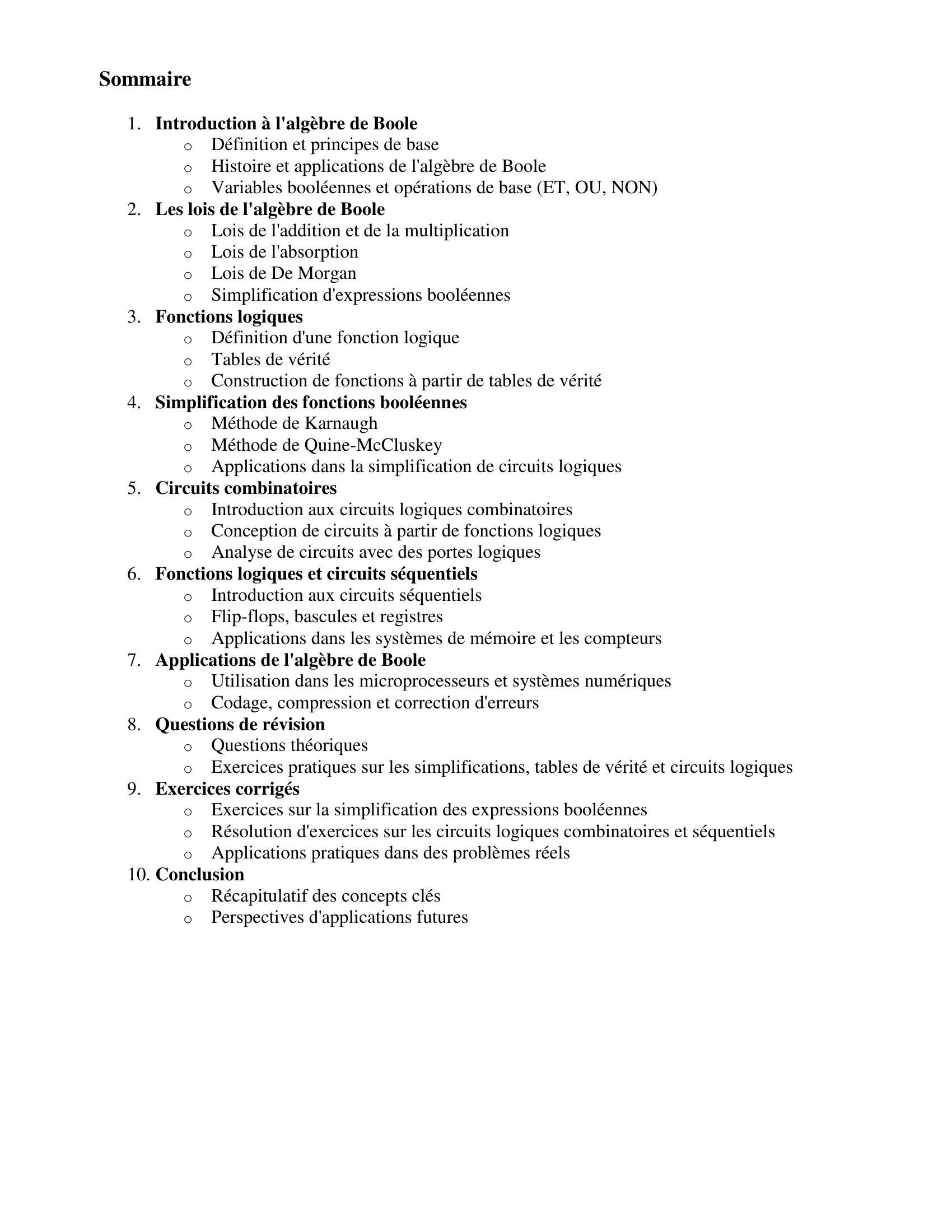L'algèbre de Boole est une branche des mathématiques qui traite des variables binaires et des opérations logiques. Elle est fondamentale en informatique et en électronique, car elle permet de concevoir des circuits logiques et de manipuler des données binaires. Les opérations de base incluent l'AND, l'OR et le NOT, qui peuvent être combinées pour former des expressions logiques complexes. Les fonctions logiques, quant à elles, sont des expressions qui prennent des valeurs d'entrée binaires et produisent une valeur de sortie binaire, souvent utilisées dans la conception de circuits numériques.