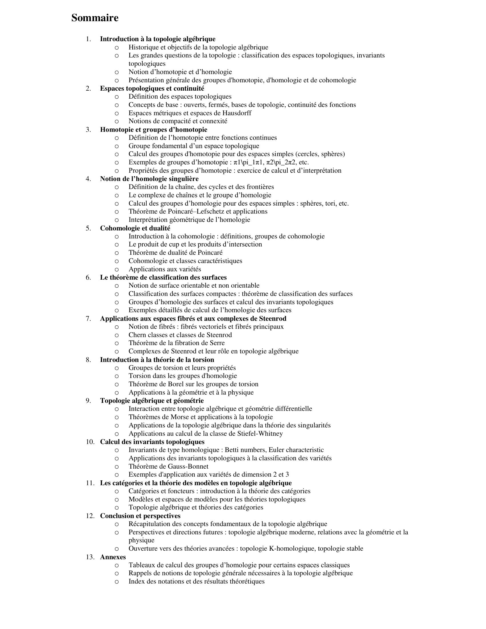 L'ouvrage présente les éléments essentiels nécessaires à l'utilisation des méthodes de la topologie algébrique : théorie des revêtements et homologie singulières. De nombreuses applications sont présentées (en économie, en théorie des jeux, en robotique, en analyse des données) et des exercices dont les solutions sont détaillées complètent le cours.