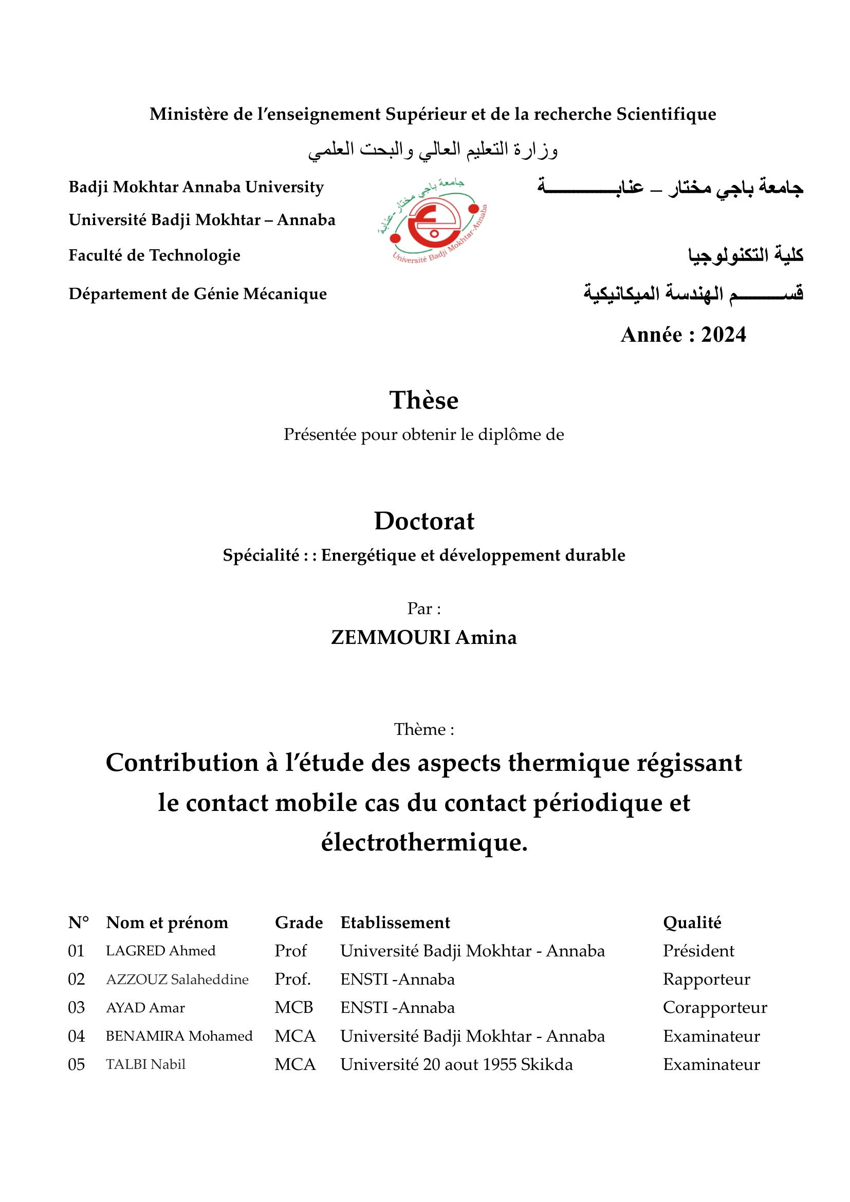Contribution à l’étude des aspects thermique régissant le contact mobile cas du contact périodique et électrothermique