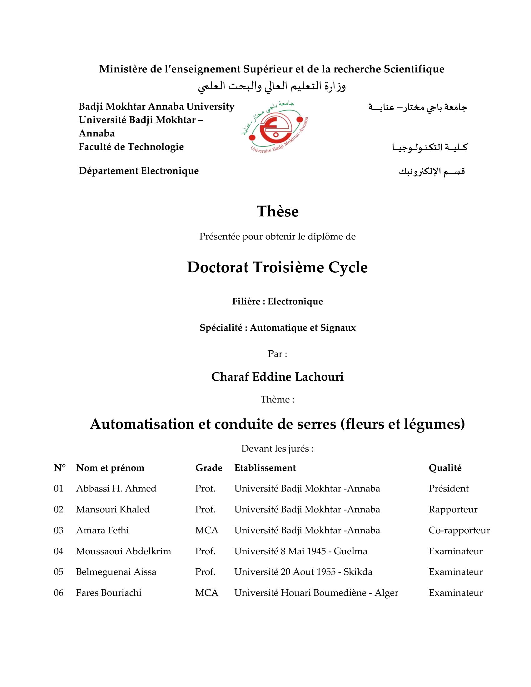 L’objectif principal de la production végétale sous serre est d’optimiser les revenus financiers des agriculteurs, ceci est réaliser en trouvant un juste équilibre entre l'optimisation de la qualité et de la quantité des produits issus de l'horticulture et la maitrise des couts financiers indispensable pour obtenir les conditions climatiques spécifiques requises pour favoriser la croissance de la plante. La croissance de la plante est principalement déterminée par les facteurs climatiques environnementaux, le niveau d'humidité et l'apport en engrais. Tandis que la serre représente un environnement clos où les paramètres climatiques et l'irrigation fertilisante sont sous contrôle. Cette thèse est structurée en quatre chapitres, Le premier chapitre (I) est réservé à la présentation d’une serre dans le cadre générale d’une gestion automatisée. Le deuxième chapitre (II) est réservé à la présentation d’un modèle de connaissance de la croissance de la plante (cas de la tomate) Le troisième chapitre (III) est réservé à la présentation d’un outil générique basé sur les concepts de la logique floue et les réseaux de neurones pour contrôler le comportement interne de la serre. Il constitue l’essence même de notre travail : l’application de cet outil générique pour contrôler le comportement de l’environnement interne d’une serre basée sur des données réelles. Le quatrième chapitre (IV) est réservé à la présentation d’une implémentation d’un contrôleur neuro-flou sur une carte FPGA.
