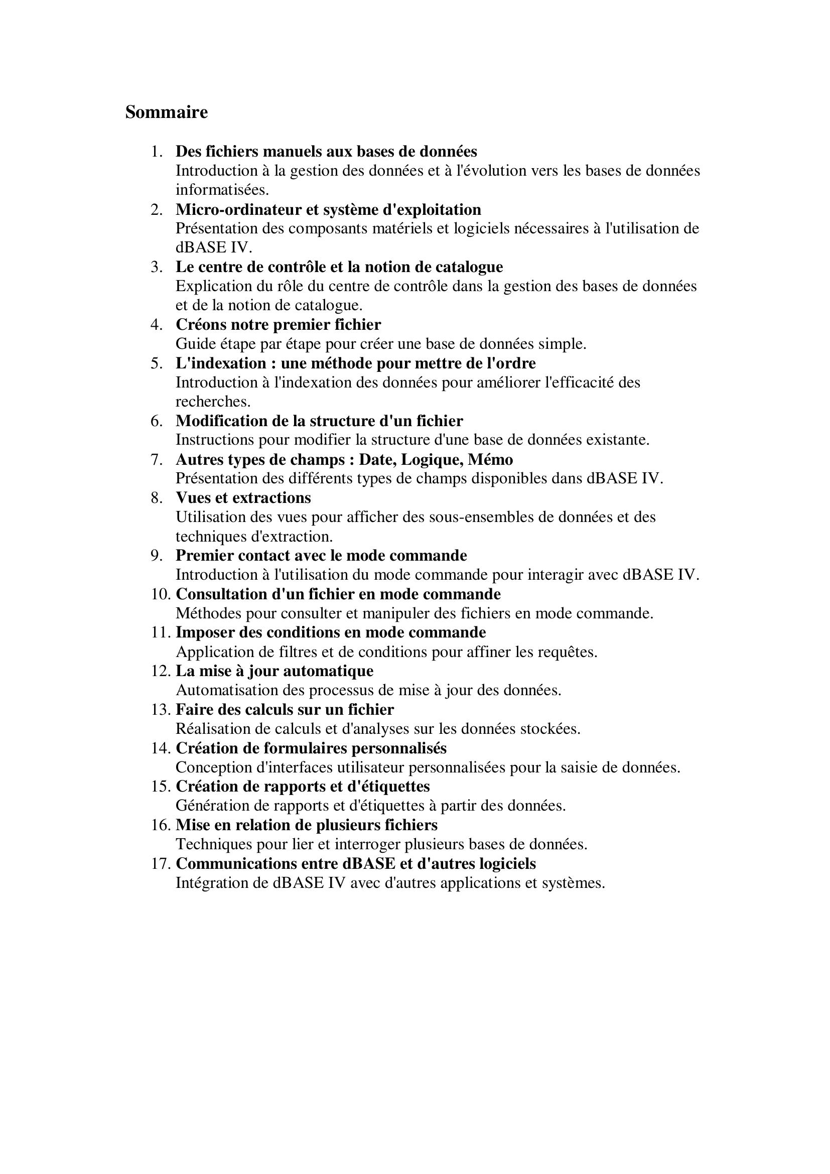 Cet ouvrage propose une approche pédagogique pour comprendre et utiliser efficacement dBASE IV. Il couvre les fonctionnalités essentielles du logiciel, allant de la création de bases de données à la programmation avancée, en passant par la gestion des fichiers et l'automatisation des tâches. L'objectif est de permettre aux lecteurs de développer des applications robustes et performantes en utilisant dBASE IV.