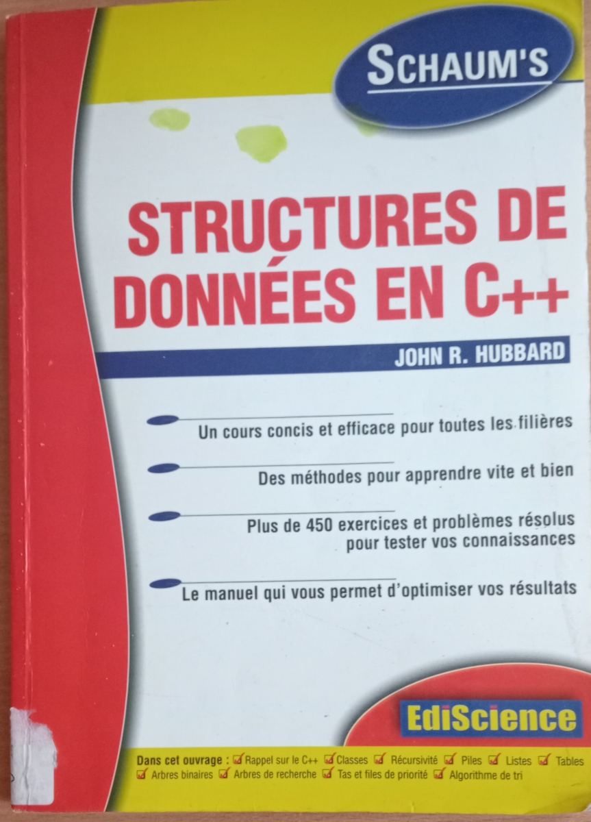 Cet ouvrage fait partie de la collection Schaum’s et s’adresse à un public en niveau intermédiaire avancé en C++. Il constitue une véritable ressource d’auto‑apprentissage Il couvre en profondeur les concepts fondamentaux et avancés de la gestion des structures de données via le C++ : Rappels sur le langage (pointeurs, classes, recursion). Structures linéaires : piles, files, listes, tables associatives. Structures arborescentes : arbres simples, arbres binaires, arbres de recherche, tas/priorité. Algorithmes de tri.