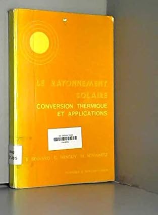 Cet ouvrage conversion thermique et applications" de R. Bernard, G. Menguy et M. Schwartz aborde les principes du rayonnement solaire et ses applications dans la conversion thermique. Le sommaire inclut des sections sur le rayonnement solaire lui-même, les différents types de conversion thermique (directe et indirecte), les applications de cette énergie, ainsi que les aspects techniques et économiques.