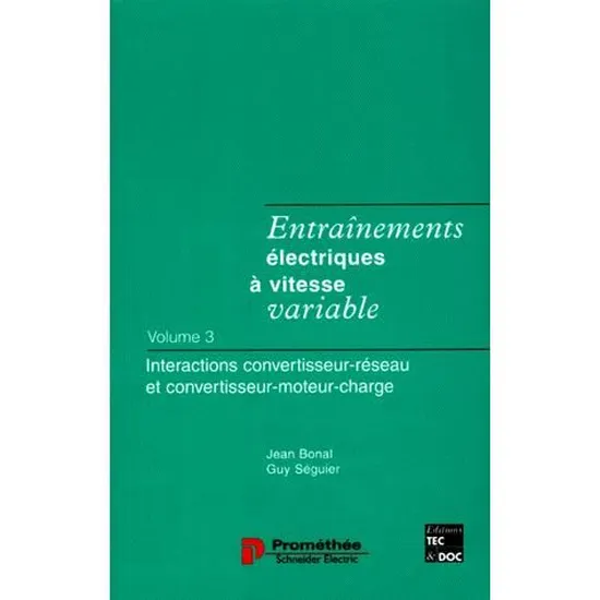 Enération d’harmoniques : le convertisseur statique (onduleur) produit des harmoniques dans le réseau, ce qui peut perturber la qualité de l’énergie. Propagation des distorsions : ces harmoniques se propagent dans le réseau électrique, avec effets possibles sur d’autres équipements et sur la stabilité globale. • Interaction moteur convertisseur charge : l’ouvrage analyse comment l’alimentation moteur via convertisseur modifie le comportement de ce dernier (flux, couple, efficacité), et comment la nature de la charge influe sur les performances globales. En résumé : ce volume examine les perturbations engendrées par les convertisseurs de vitesse variable (harmoniques), leur impact sur le réseau, et l’influence réciproque entre convertisseur, moteur et charge