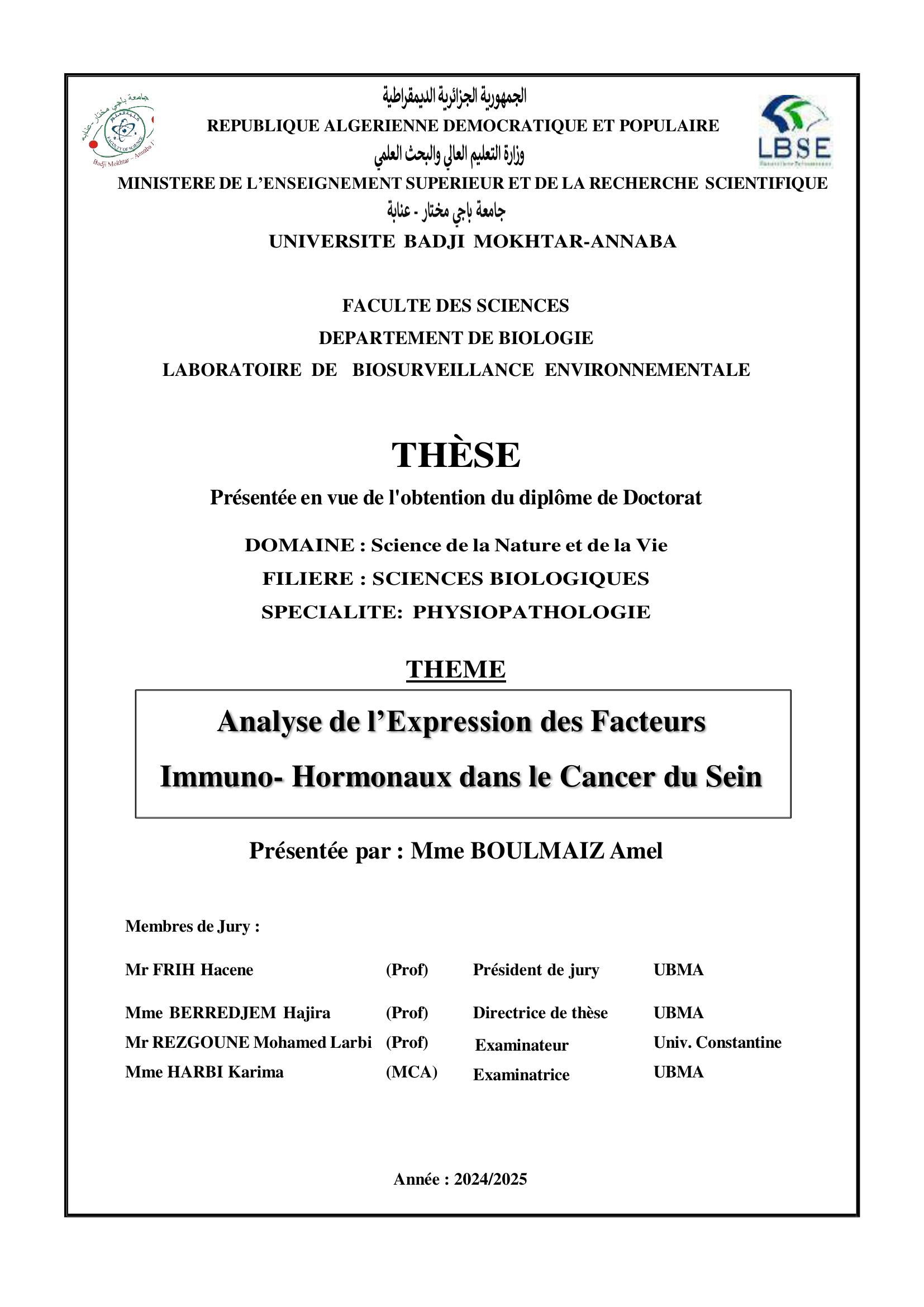 Analyse de l’expression des facteurs immuno- hormonaux dans le cancer du sein