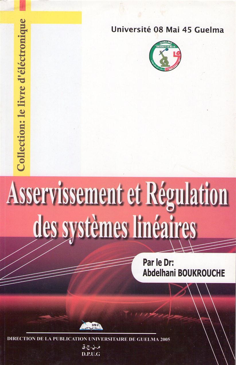 Ce document consacré aux problèmes d’asservissement et de régulation des systèmes linéaires, s’adresse essentiellement aux étudiants d’Electronique, d'Electrotechnique, de Génie des procédés, et de Mécanique, des cycles court et long, qui désirent s’initier de façon pratique aux principes classiques de la matière. Cet ouvrage n’a pas la prétention de traiter toute la matière, mais il permettra aux lecteurs de bien assimiler les principes fondamentaux. Il comporte deux parties, une première partie qui traite des systèmes définis par leurs fonctions de transfert, et une deuxième partie qui considère les systèmes représentés par un modèle d’état. Des notions simplifiées sur le problème de la commande optimale et la poursuite optimale figurent dans le contenu, dans le but de donner une idée pour les étudiants des différentes spécialités de formation. Il est à noter que les étudiants d’électronique auront à suivre cette partie plus en détails dans une autre matière intitulée la Commande des systèmes.