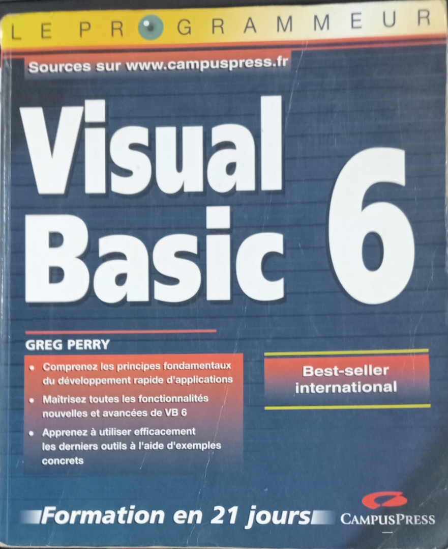 Cet ouvrage propose une formation progressive sur 21 jours, accompagnée d’exercices pratiques, pour apprendre Visual Basic 6 du niveau débutant à avancé : Vous apprendrez à maîtriser l’environnement VB6, créer des interfaces conviviales et écrire des programmes efficaces et faciles à maintenir. Le livre couvre les contrôles standard, les menus, la gestion des données, les boucles, les structures conditionnelles, la saisie utilisateur, etc. Il inclut l’utilisation des contrôles ActiveX, l’intégration de multimédia, la programmation orientée objet, ainsi que l’accès aux bases de données (DAO/ADO) et à l’Internet (WebBrowser, FTP, mails). Enfin, il présente le débogage, les tests, la distribution des applications via l’assistant de déploiement VB, ainsi que deux chapitres bonus sur les tableaux multidimensionnels et l’API Windows .