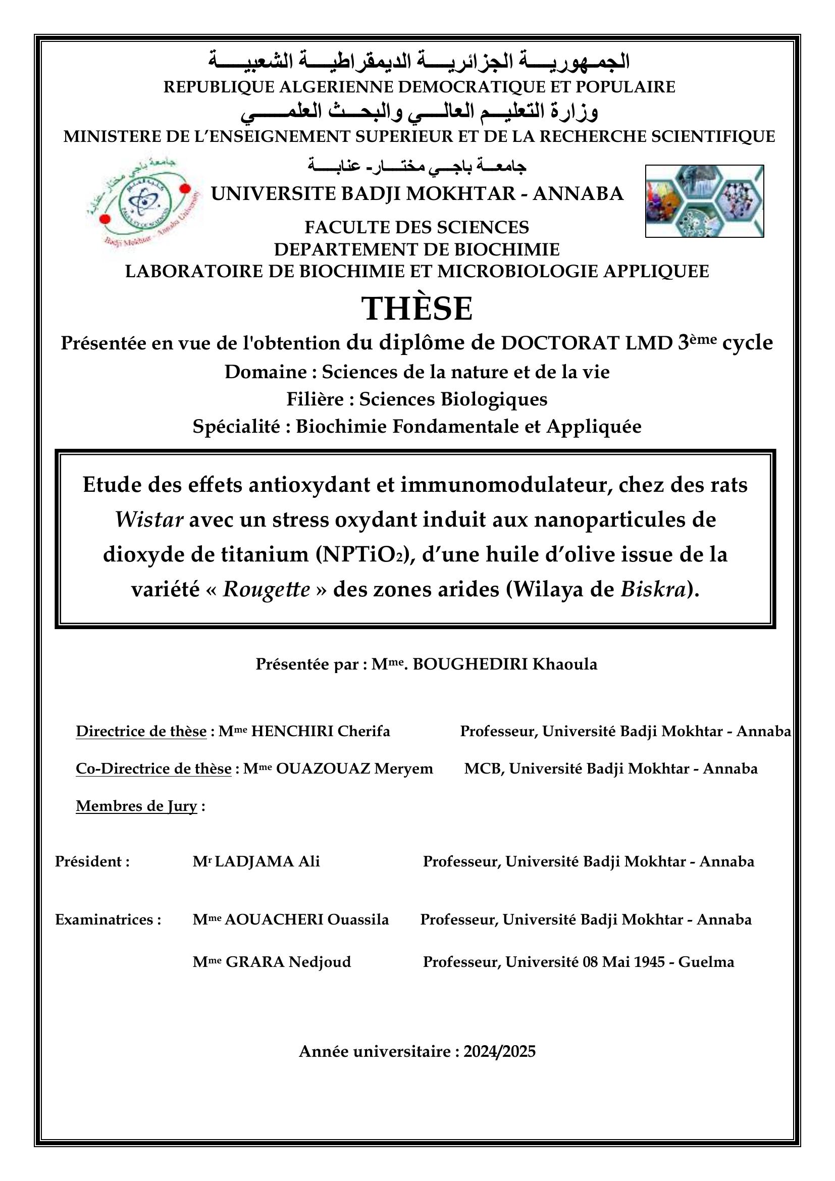 Etude des effets antioxydant et immunomodulateur, chez des rats Wistar avec un stress oxydant induit aux nanoparticules de dioxyde de titanium (NPTiO2), d’une huile d’olive issue de la variété « Rougete » des zones arides (Wilaya de Biskra)