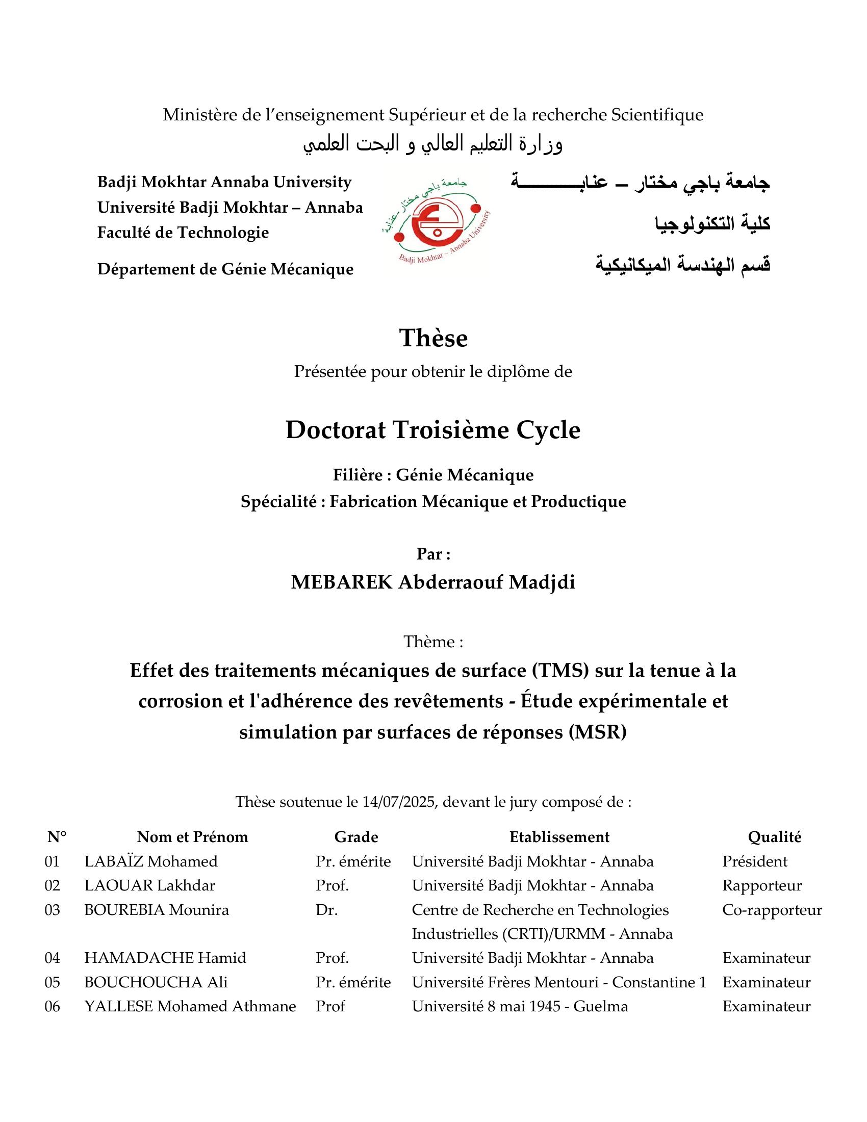 Effet des traitements mécaniques de surface (TMS) sur la tenue à la corrosion et l'adhérence des revêtements - Étude expérimentale et simulation par surfaces de réponses (MSR)