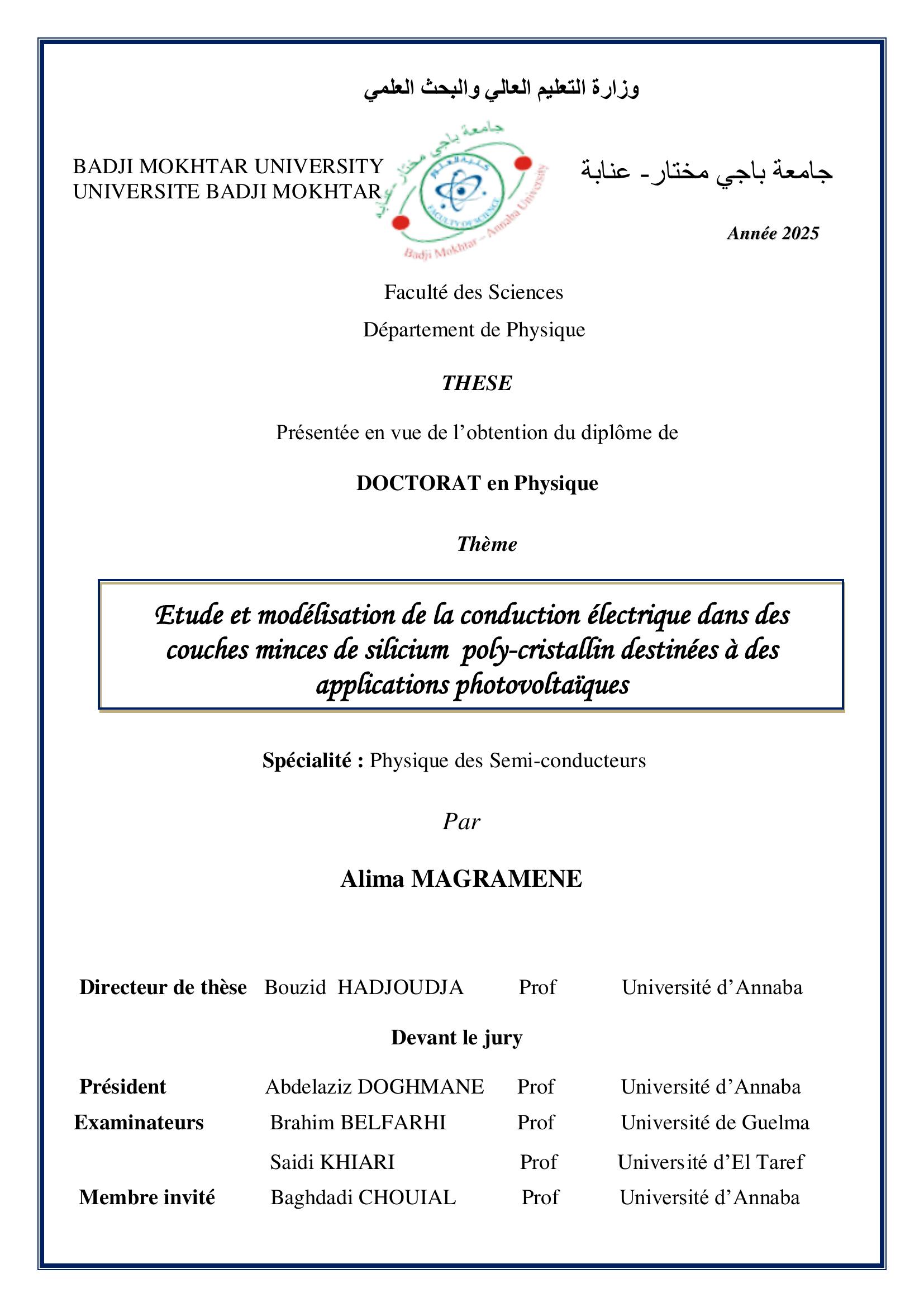 Les couches minces de silicium poly-cristallin (Si-poly) sont largement utilisées dans les applications photovoltaïques. Cependant, le principal inconvénient est l’activité électronique des joints de grains qui affecte les performances des cellules solaires basées sur ce type de matériau. Dans ce travail, nous avons étudié la modélisation de la conduction électrique dans des couches minces de Si-poly. Nous en avons déduit que le modèle de piégeage des porteurs, permet d’expliquer d’une façon relativement satisfaisante les caractéristiques électriques en fonction du dopage et de la température. Cependant, pour permettre une meilleure explication des variations des caractéristiques électriques dans le Si-poly, on doit tenir compte des deux modèles de conduction : le modèle de ségrégation des atomes de dopant et celui du piégeage des porteurs aux joints de grains. Par ailleurs, afin de minimiser l’impact de l’activité électronique des joints de grains, qui influence le rendement de conversion photovoltaïque, des traitements thermiques préalables au dopage ainsi que des recuits sous hydrogène ont été effectués sur des couches minces de Si-poly dopées au phosphore. Des caractérisations par mesures d’effet Hall (HMS-3000) ont montré que les traitements thermiques avant dopage permettent d’améliorer la concentration en porteurs libres de 15 à 55% pour des températures comprises entre 1000 et 1150 °C. De plus, ils favorisent une augmentation de la mobilité des porteurs ainsi qu’une réduction de la résistivité des couches minces étudiées. En revanche, le recuit sous hydrogène a permis une augmentation de 10 à 18% de la concentration en porteurs libres, une réduction de la résistivité et une amélioration de la mobilité des porteurs. Des analyses par microscope électronique à balayage (MEB) ont confirmées les résultats obtenus par HMS-3000. Elles ont montré que l’augmentation de la température des traitements thermiques avant dopage entraîne une croissance de la taille moyenne des grains. Cela se traduit par une réduction du volume global des joints de grains, entraînant à son tour une diminution de la densité des états pièges et des sites de ségrégation. On en déduit ainsi que des traitements thermiques suivis d’un recuit sous hydrogène favorisent la passivation des joints de grains, et conduisent à une amélioration des caractéristiques électriques, et par suite, du rendement des cellules solaires fabriquées à base des couches minces de Si-poly.