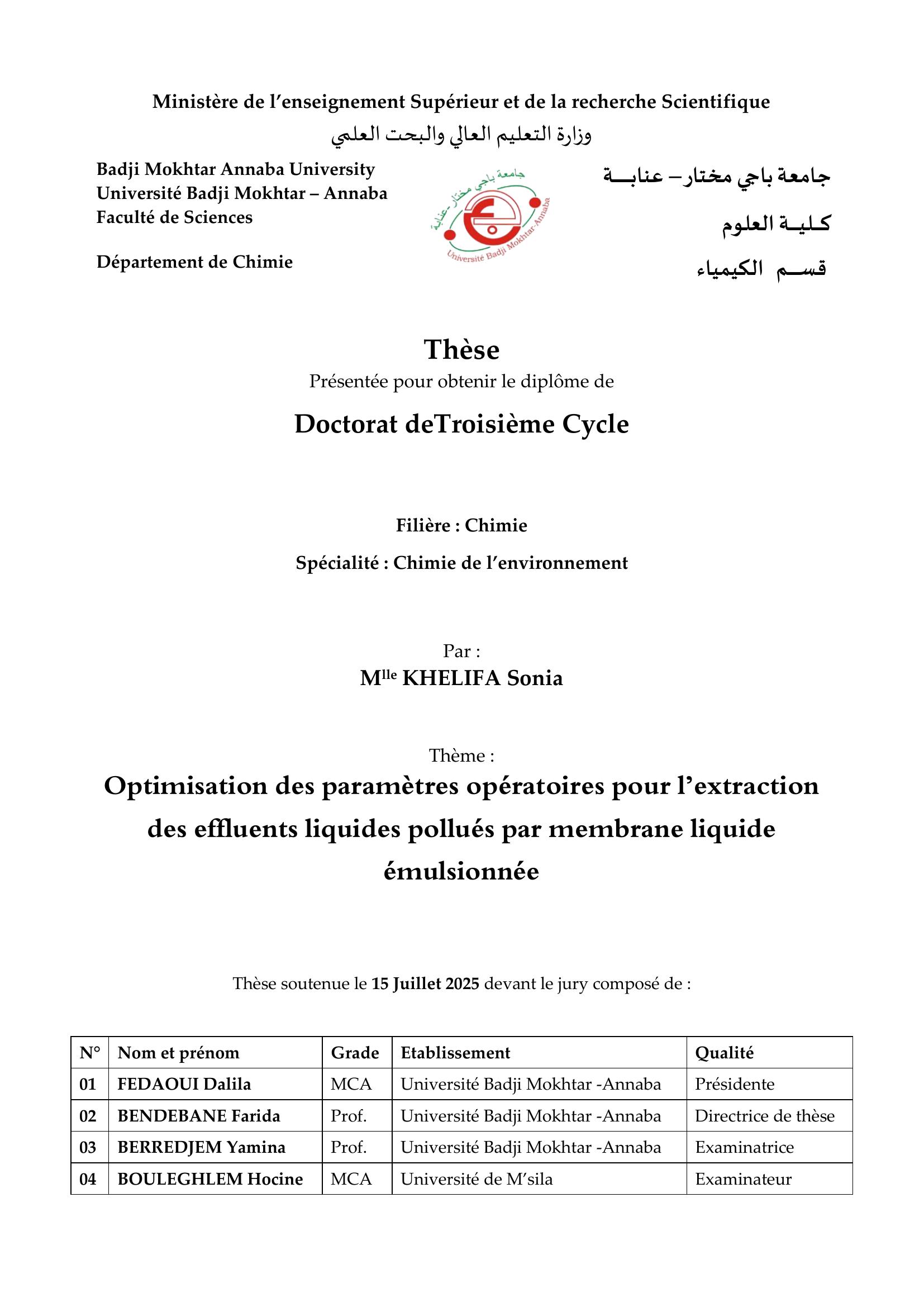 Optimisation des paramètres opératoires pour l’extraction des effluents liquides pollués par membrane liquide émulsionnée