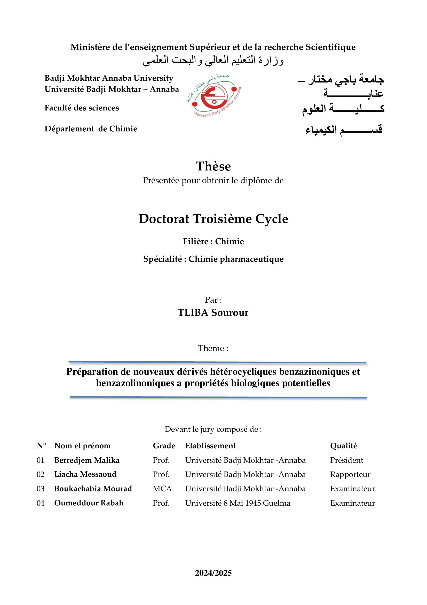 Les systèmes hybrides hétérocycliques possèdent souvent des propriétés entièrement différentes et améliorées par rapport à leurs molécules mères d’origine. L’étude de la littérature a révélée que la synthèse des N˗acylhydrazones dérivés de la 1,4˗benzothiazin˗3˗one; pharmacophore observé dans de nombreuses substances bioactives et ayant des propriétés pharmacologiques très variées n’a pas été étudiée. Dans cette optique, l’objectif principal de ce travail de thèse était de développer une méthodologie synthétique permettant l’accès en particulier à de systèmes hétérocycliques benzothiazinoniques. Cependant, il a été jugé intéressant de tenter la synthèse de composés contenant le noyau 1,4˗benzothiazine˗3˗one. Pour cela, nous avons associé deux pharmacophores importants en une seule molécule, représentée par un fragment benzothiazine et une autre structure de type N˗acylhydrazone, conduisant à la formation exclusive des isomères E des N˗acylhydrazones souhaités: (E)-N'-(benzylidène substitué)-2(3-oxo-2H-benzo[b][1,4]thiazin-4(3H)-yl)acétohydrazides via des procédures simples et générales. Les principaux points qui ont été pris en compte sont les suivants: Le comportement stéréochimique des composés N˗acylhydrazones nouvellement synthétisés, les résultats des méthodes de chauffage conventionnel par comparaison à celle des irradiations aux ultrasons (US),ainsi que les informations mécanistiques qui sont également présentées et discutées pour la réaction ciblée. En effet, d’après l’analyse spectrale 1H˗RMN et 13C˗RMN effectuée sur les structures de tous les nouveaux N˗acylhydrazones synthétisées dans le DMSO˗d6, il a été conclu que ces composés existent sous forme de deux stéréoisomères (syn˗E et anti˗E) avec des pourcentages différents des rapports isomériques. Certains composés préparés ont été testés pour leur activité antioxydante in vitro (test au DPPH), et la majorité des composés ont montrés une activité antioxydante modérée.