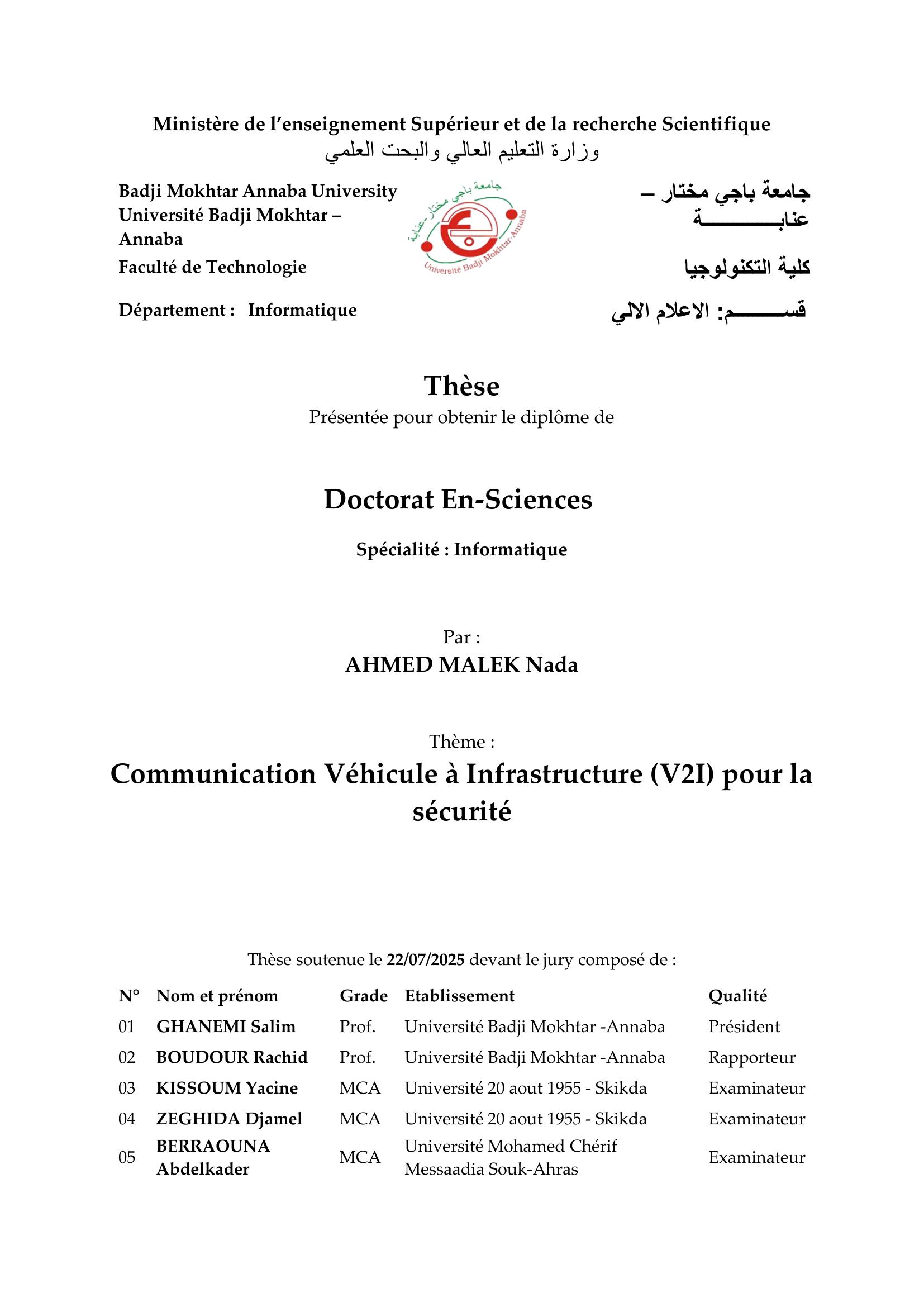 La sécurité routière est une préoccupation majeure dans le monde entier, avec une urbanisation croissante et des infrastructures de transport vieillissantes contribuant à des taux élevés d'accidents, notamment dans les pays en développement comme l'Algérie. Cette recherche explore le rôle de la communication véhicule-à-infrastructure (V2I) dans le cadre des Systèmes de Transport Intelligents (STI) pour améliorer la sécurité routière. En permettant une interaction en temps réel entre les véhicules et les infrastructures routières, la V2I a le potentiel de réduire les accidents, de mieux gérer le trafic et d'améliorer l'efficacité générale des transports. Cette thèse commence par un examen des technologies V2I actuelles, en se concentrant sur les cadres techniques et opérationnels qui soutiennent ces systèmes. L'étude aborde les défis spécifiques auxquels l'Algérie est confrontée, tels que le vieillissement des infrastructures et les contraintes réglementaires, et identifie comment la V2I peut être adaptée à ce contexte. Les principaux objectifs de la recherche incluent l'évaluation de l'efficacité de la communication V2I dans la prévention des accidents, l'analyse des exigences techniques pour son implémentation et la proposition d'un cadre pour son intégration dans le système de transport algérien. La méthodologie combine des simulations à l'aide de SUMO (Simulation of Urban Mobility) et un prototypage basé sur des systèmes Arduino, testant divers scénarios de communication V2I dans différentes conditions de trafic. Les simulations révèlent des améliorations significatives dans la gestion du trafic et lavention des accidents, validant l'efficacité de la V2I dans la réduction des risques de collision et l'amélioration de la sécurité routière. Les prototypes démontrent la faisabilité pratique de déployer des systèmes V2I dans des environnements réels, en tenant compte des infrastructures locales et des facteurs d'acceptation sociale. Les résultats montrent que l'adoption de la V2I dans les villes algériennes pourrait considérablement réduire les taux d'accidents de la route et améliorer le flux de circulation. L'étude se termine par des recommandations stratégiques à l'intention des décideurs politiques, des développeurs d'infrastructures et des techniciens, offrant une feuille de route pour la mise en œuvre des systèmes V2I en Algérie. Des pistes pour des recherches futures sont également suggérées, y compris l'intégration de l'intelligence artificielle pour améliorer encore les capacités des systèmes V2I dans la prédiction et la prévention des accidents.