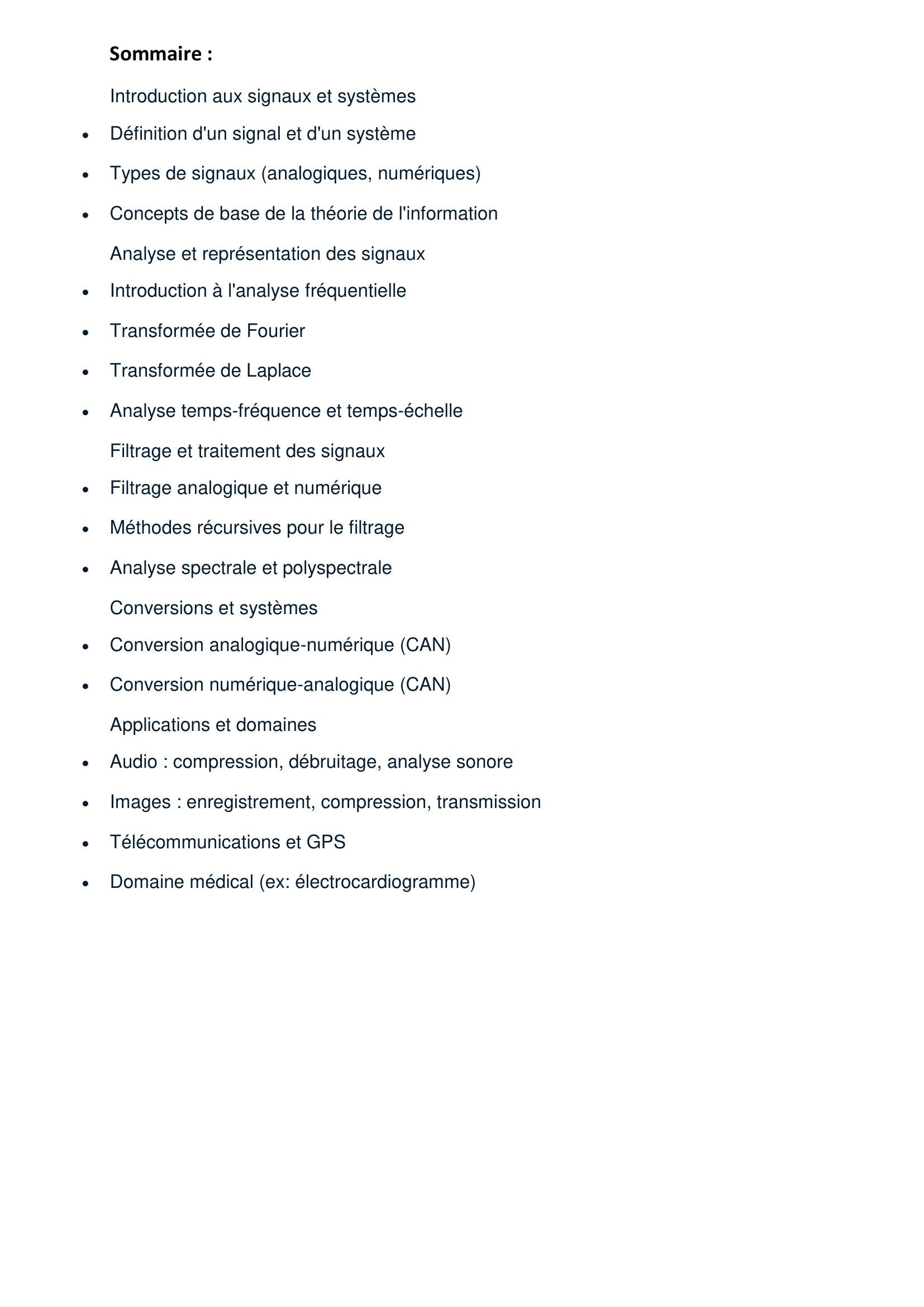 Ce manuel constitue une introduction aux notions fondamentales du traitement du signal, destiné principalement aux étudiants en électronique, électrotechnique, télécommunications et informatique industrielle. L’ouvrage expose les concepts de base permettant de modéliser, analyser et transformer les signaux. On y trouve : * La définition des signaux (déterministes, aléatoires, continus, discrets, périodiques, apériodiques) et leurs principales caractéristiques temporelles et fréquentielles. Les notions d’opérateurs linéaires et de systèmes (linéarité, invariance temporelle, causalité, stabilité). * L’analyse fréquentielle des signaux : séries de Fourier, transformée de Fourier, transformée de Laplace et transformée en Z pour les signaux discrets. * L’étude de la convolution, de la réponse impulsionnelle et de la réponse fréquentielle des systèmes. * Les bases de l’échantillonnage et de la reconstruction des signaux (théorème de Shannon, aliasing). * Une introduction aux filtres analogiques et numériques, ainsi qu’aux méthodes de traitement de signaux numériques.