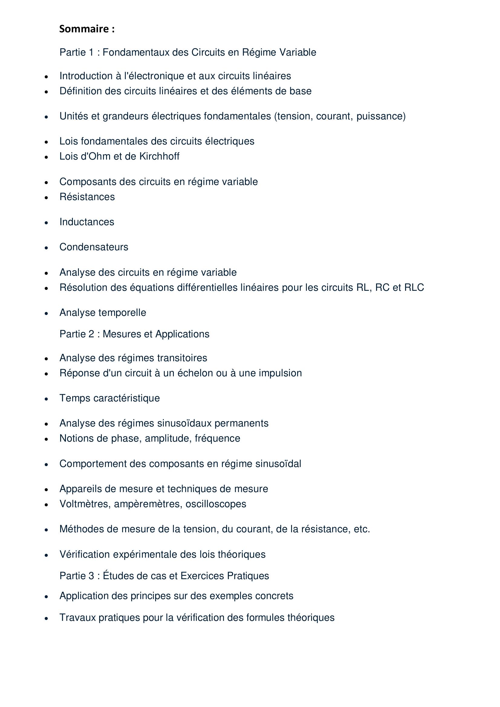 Ce premier tome traite des principes fondamentaux et des techniques pratiques de **mesures appliquées aux circuits électroniques fonctionnant en régime variable** (régime sinusoïdal, transitoire et périodique). L’ouvrage met l’accent sur les outils et méthodes permettant de caractériser les grandeurs électriques, la réponse fréquentielle et temporelle des circuits, ainsi que les phénomènes liés aux signaux réels. Il couvre notamment : * Les bases de la mesure électronique : grandeurs électriques, unités, précision et erreurs. * Les instruments essentiels (oscilloscopes, analyseurs, ponts de mesure, générateurs de signaux). * L’étude des circuits linéaires et non linéaires soumis à des signaux variables. * La caractérisation en fréquence : filtres, résonance, diagrammes de Bode, bande passante. * Les mesures en régime transitoire et les phénomènes liés aux commutations. * Les techniques de détection et de traitement des signaux. * L’interprétation et la validation des résultats expérimentaux. Cet ouvrage est conçu comme un support pédagogique et pratique, destiné aux étudiants en électronique, aux techniciens et aux ingénieurs souhaitant maîtriser les méthodes de mesure appliquées aux circuits travaillant en régime variable.