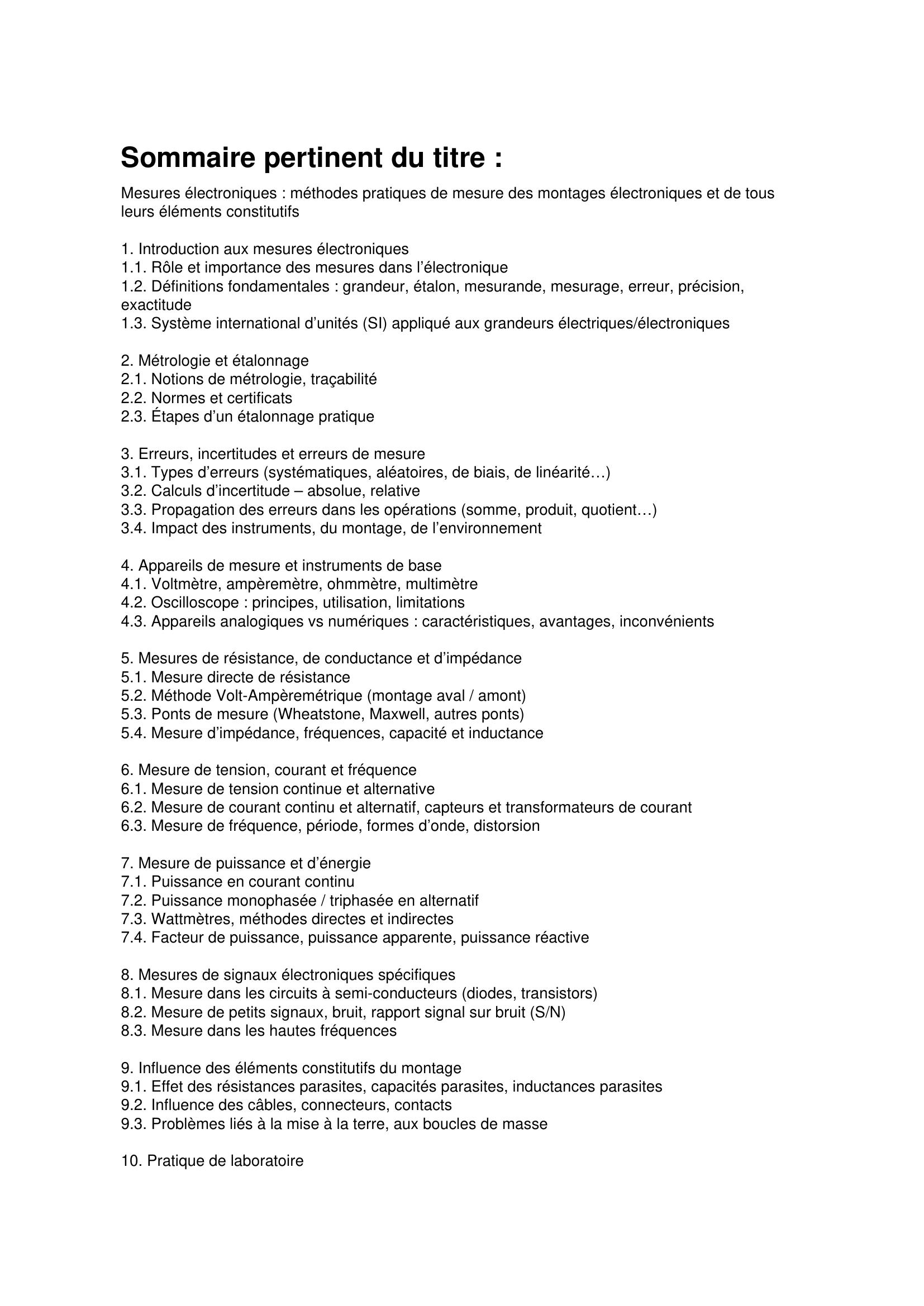 Cet ouvrage est consacré aux méthodes de mesure appliquées en électronique, tant pour l’étude des composants isolés (résistances, condensateurs, bobines, diode. Il met l’accent sur : * Les principes fondamentaux de la mesure électrique et électronique (grandeurs de base, unités, normes). * La description et l’utilisation des appareils de mesure courants : multimètres, oscilloscopes, générateurs de signaux, ponts de mesure, analyseurs. * Les méthodes pratiques de caractérisation des composants passifs (mesure de résistances, capacités, inductances, pertes, tolérances). * La mesure des composants actifs (caractéristiques des diodes, transistors bipolaires, MOSFET, circuits intégrés analogiques et logiques). * Les techniques de mesure appliquées aux montages électroniques : amplificateurs, oscillateurs, filtres, alimentations, convertisseurs. * Les problèmes d’erreurs de mesure, d’incertitude et de précision, ainsi que les bonnes pratiques pour obtenir des résultats fiables. * Une partie pratique avec des exemples concrets et montages expérimentaux destinés à l’apprentissage en laboratoire.