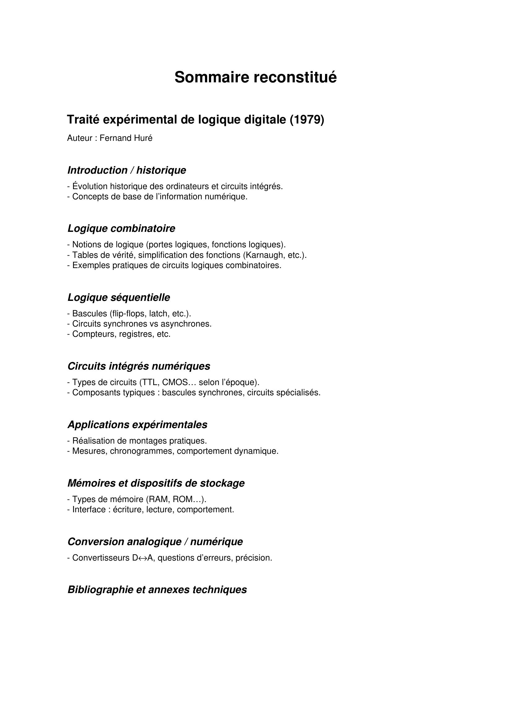 Le Traité expérimental de logique digitale de Fernand Huré (1979) est un manuel à vocation pédagogique qui présente les fondements de la logique numérique tout en insistant sur l’expérimentation concrète. L’auteur y expose d’abord les bases théoriques de la logique binaire : fonctions logiques, tables de vérité, simplification par cartes de Karnaugh et lois fondamentales comme celles de De Morgan. L’ouvrage aborde ensuite la logique combinatoire et les circuits séquentiels, en détaillant les principaux composants tels que les portes logiques, les bascules, les compteurs ou les registres. Un accent particulier est mis sur l’étude pratique des circuits intégrés, avec des expériences destinées à vérifier et comprendre leur fonctionnement réel. Le livre traite également de la mémoire, des systèmes de codage, de l’affichage et des applications dans des systèmes plus complexes, tout en restant centré sur la technologie disponible à la fin des années 1970 (logique TTL et CMOS). Bien qu’il paraisse aujourd’hui daté au regard des évolutions des microprocesseurs et des circuits programmables modernes, il conserve une valeur importante pour comprendre les bases de la conception numérique et pour son approche expérimentale, qui fait le lien entre théorie et pratique.