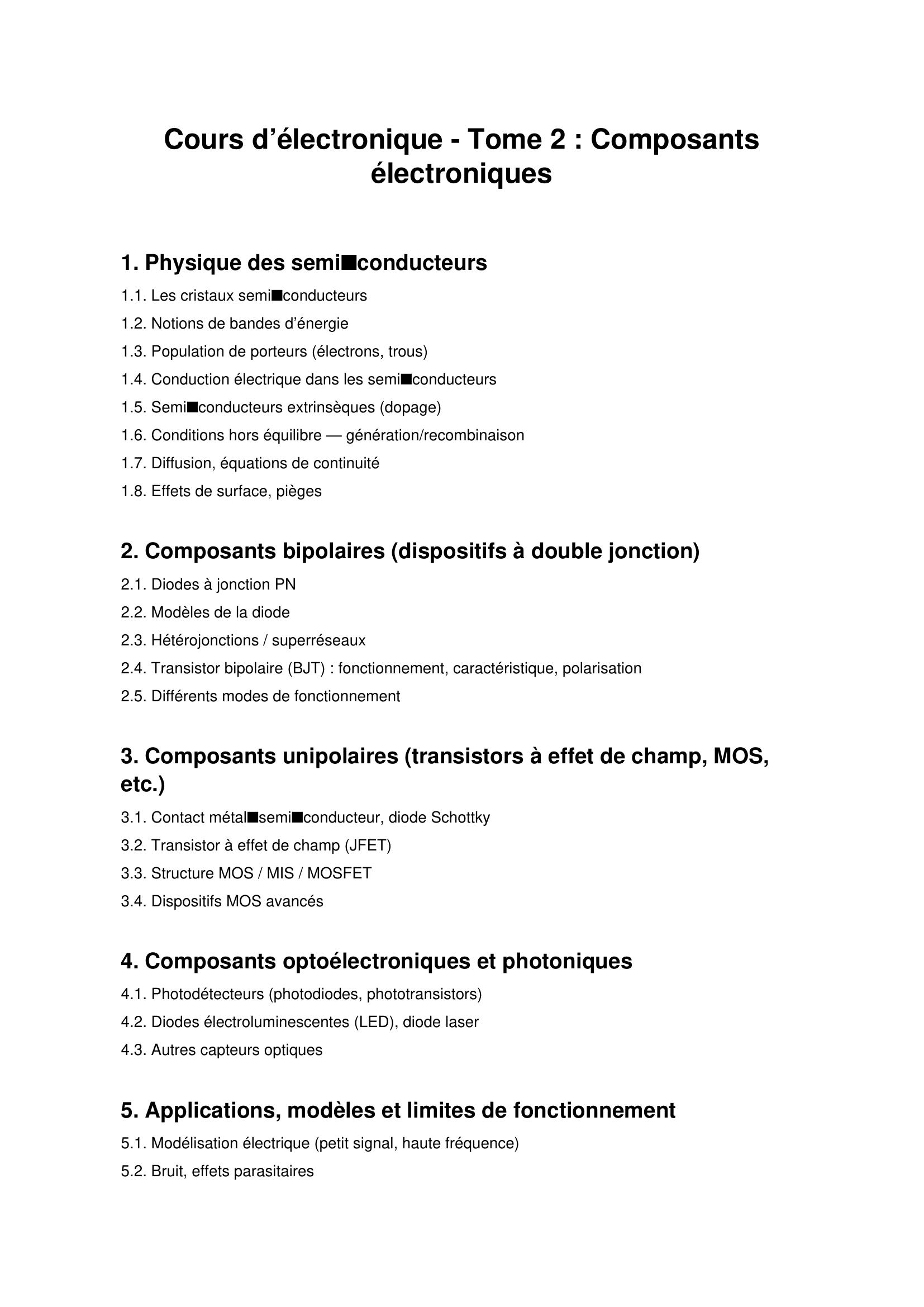 Ce tome présente les principes, les caractéristiques et les applications des composants électroniques, en distinguant les éléments passifs et actifs. Il constitue un support théorique et pratique pour les étudiants en électronique, avec un équilibre entre fondements, modélisation et usage. Principaux thèmes abordés : 1. Composants passifs - Résistances : limitation de courant, chute de tension, puissance dissipée. - Condensateurs : stockage de charge, rôle dans filtres et découplage. - Inductances : principe électromagnétique, régimes transitoires, transformateurs. 2. Composants semi‑conducteurs - Diodes : polarisation directe/inverse, diodes Zener, LEDs, Schottky. - Transistors bipolaires : polarisation, caractéristiques, amplification et commutation. 3. Régimes transitoires et réponses en fréquence - Circuits RC et RL, réponses aux signaux, diagrammes de Bode, fonctions de transfert. 4. Applications et dimensionnement - Circuits d’alimentation, de filtrage et de redressement. - Contraintes pratiques : tolérances, pertes, limites de tension et de courant