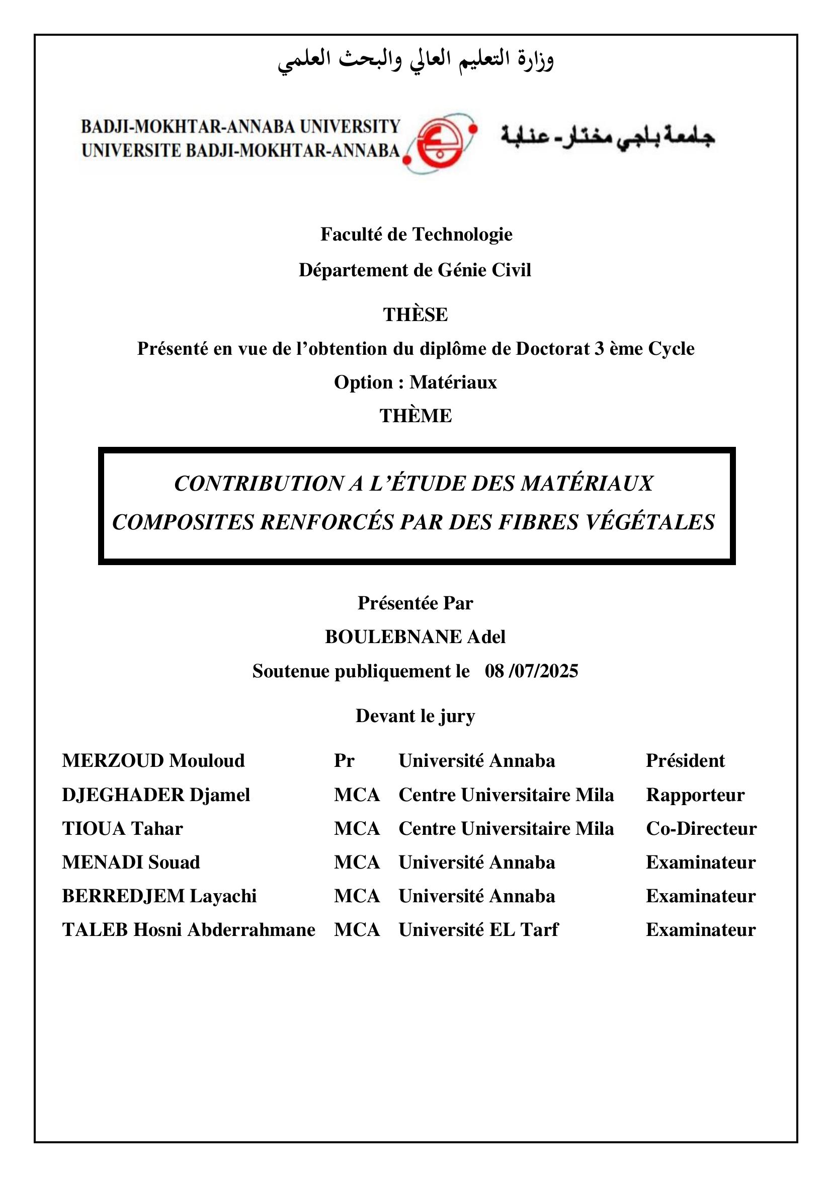 Contribution a l’étude des matériaux composites renforcés par des fibres végétales