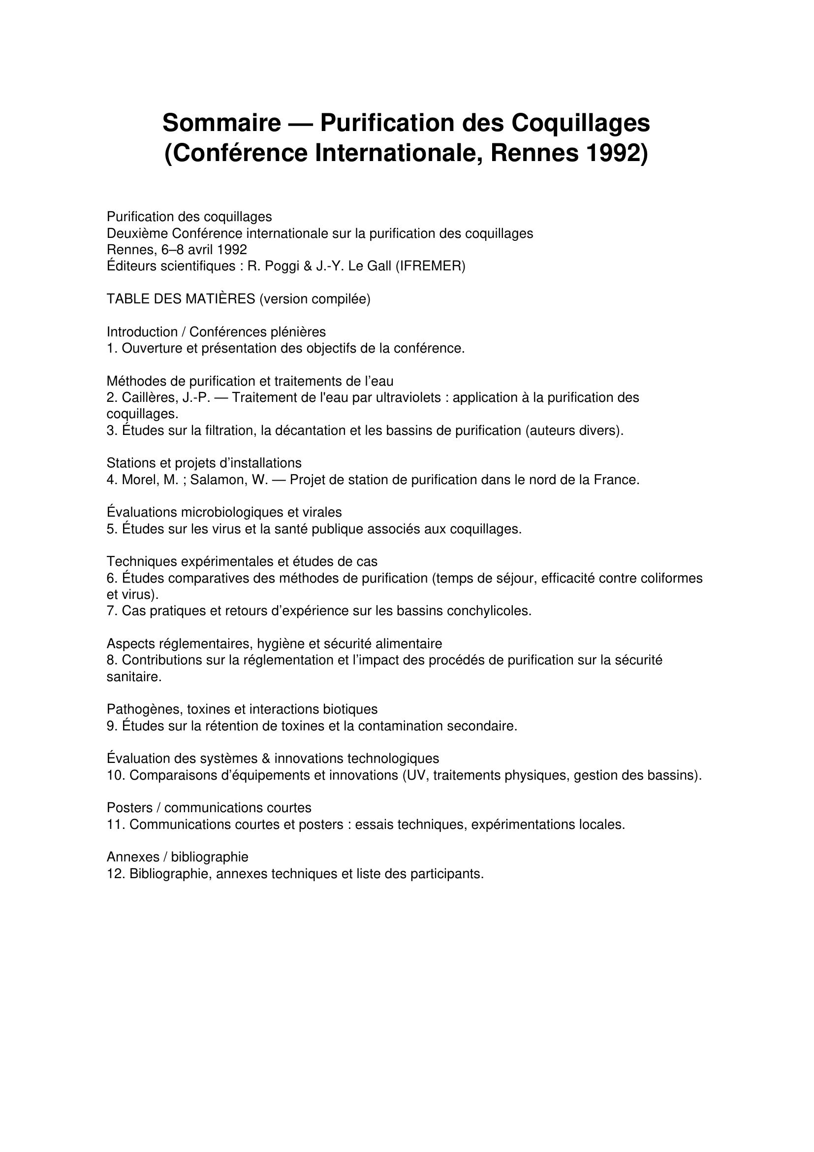 Cette conférence était axée autour de plusieurs thèmes : Aspects généraux du problème de l'hygiène des coquillages, perspectives et évolution. Contamination, décontamination et détoxication. Analyse, évaluation et prévention des risques. Traitement de l'eau et des coquillages. Ergonomie, conduite et économie d'une installation. En conclusion, une série de recommandations ont été préconisées sur chaque sujet débattu. (L'ensemble de ces thèmes est pris en compte par la directive européenne 91/492 du 15/07/1991 - en cours de traduction en droit français - relative aux règles de mise en marché des mollusques bivalves vivants).
