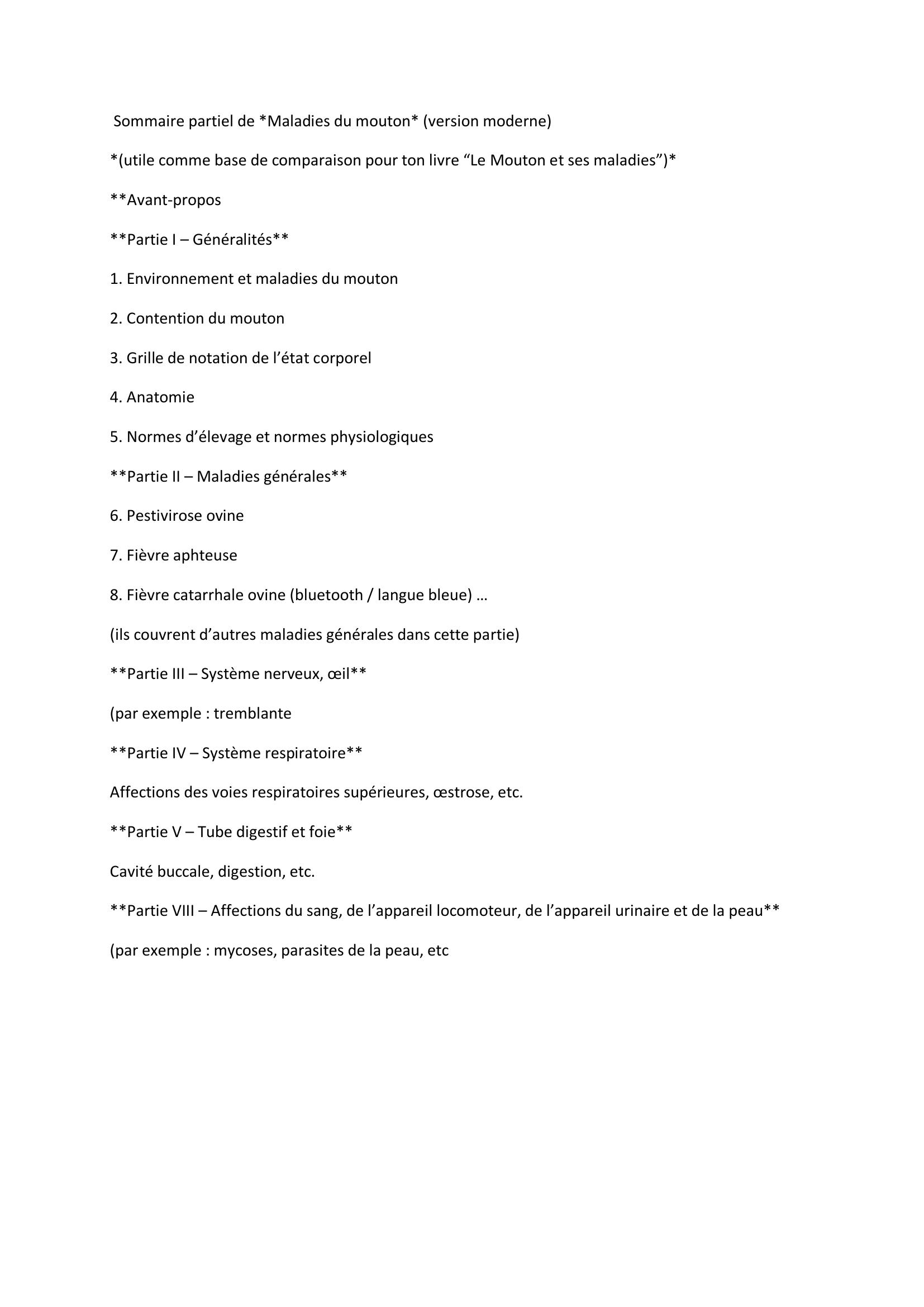 L’ouvrage s’ouvre sur des conseils généraux d’élevage : hygiène, conduite du troupeau, mesures préventives, suivi sanitaire. Il rappelle aussi les bases anatomiques et physiologiques nécessaires pour comprendre les affections.Pour chaque maladie ou groupe de maladies, le livre décrit : les **signes cliniques**, les **éléments de diagnostic**, les **modes de transmission ou d’origine**, les **mesures de traitement (médicaments, posologie, mode d’administration)**, ainsi que les **mesures de prévention** (vaccination, gestion du troupeau, isolement, lutte antiparasitaire). Il intègre des photos, schémas et dessins pour aider à la reconnaissance visuelle des lésions.