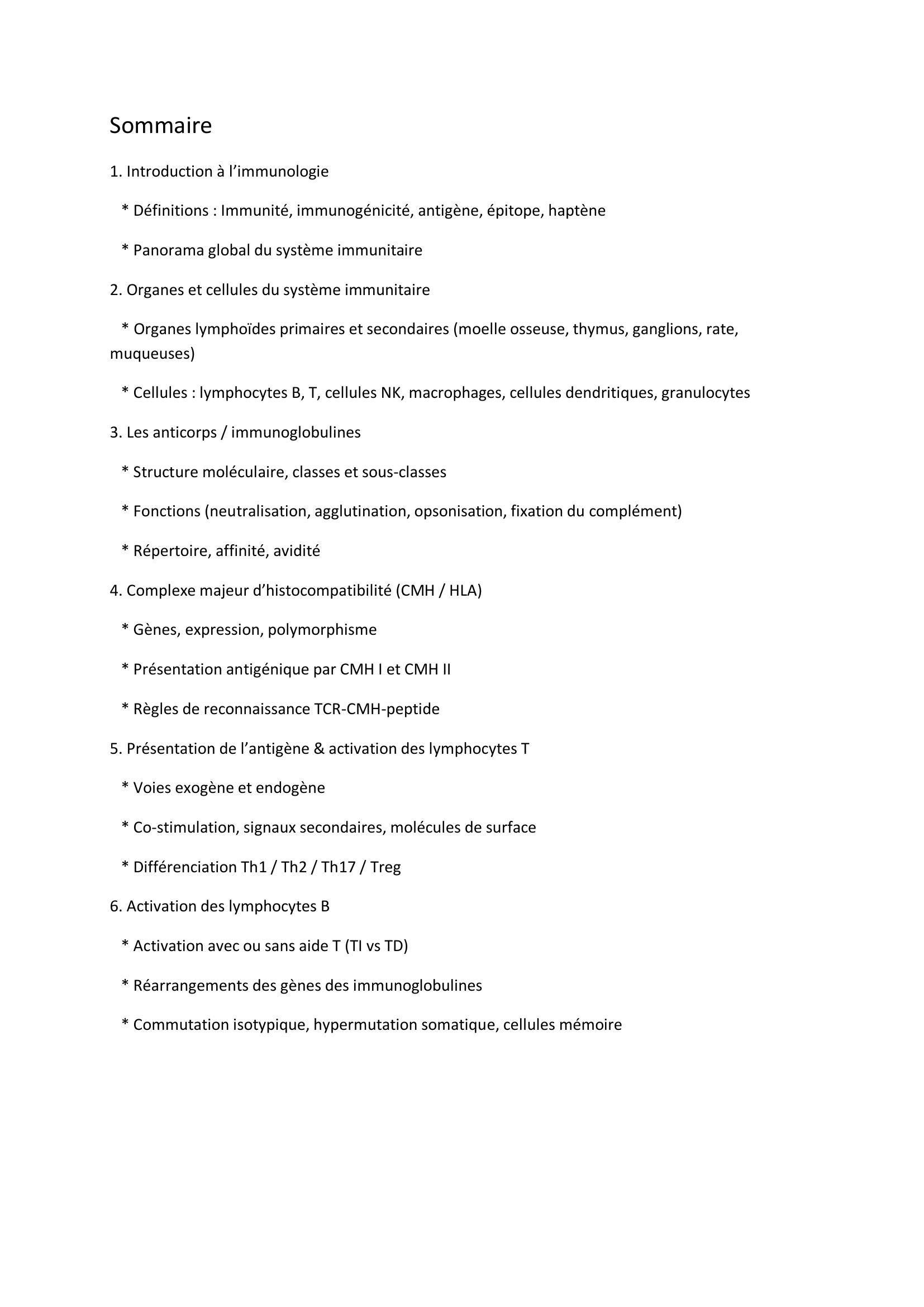 Ce guide de révision en immunologie, conçu pour les étudiants en médecine, biologie et sciences de la santé, présente de manière condensée les bases essentielles du système immunitaire et ses applications cliniques. 1. Introduction à l’immunologie L’immunologie est la science qui étudie les mécanismes de défense de l’organisme contre les agents pathogènes. Elle repose sur deux grandes branches : l’immunité innée (rapide et non spécifique) et l’immunité adaptative (spécifique et à mémoire). 2. Immunité innée L’immunité innée comprend les barrières physiques (peau, muqueuses), les cellules phagocytaires (macrophages, neutrophiles), les cellules NK et les médiateurs solubles (complément, cytokines). Elle agit immédiatement pour limiter l’infection. 3. Immunité adaptative Elle fait intervenir les lymphocytes B (production d’anticorps) et T (cytotoxicité et aide immunitaire). Elle nécessite une phase d’apprentissage et confère une mémoire immunitaire durable. 4. Anticorps et immunoglobulines Les anticorps sont produits par les plasmocytes. Ils neutralisent les agents pathogènes et favorisent leur élimination. Les classes principales (IgM, IgG, IgA, IgE, IgD) jouent des rôles spécifiques selon le contexte immunitaire. 5. Activation et régulation de la réponse immunitaire Les cellules présentatrices d’antigène (CPA) déclenchent la réponse adaptative. Les interactions entre cytokines, récepteurs et cellules assurent une régulation fine évitant l’auto-immunité. 6. Tolérance et auto-immunité Le système immunitaire doit tolérer le “soi” pour éviter les maladies auto-immunes. La perte de tolérance conduit à des pathologies comme le lupus, la polyarthrite rhumatoïde ou le diabète de type 1. 7. Hypersensibilité et allergies L’hypersensibilité résulte d’une réponse immunitaire exagérée : immédiate (IgE, mastocytes, histamine) ou retardée (lymphocytes T). 8. Immunodéficiences Elles peuvent être congénitales (ex. : déficit en anticorps, déficit combiné sévère) ou acquises (ex. : infection par le VIH). Elles entraînent une susceptibilité accrue aux infections. 9. Immunologie des tumeurs et de la transplantation Le système immunitaire détecte et élimine les cellules tumorales (immunosurveillance). Les greffes nécessitent une compatibilité HLA et un contrôle du rejet par immunosuppression. 10. Vaccination et immunothérapie La vaccination exploite la mémoire immunitaire pour prévenir les maladies. L’immunothérapie, comme les anticorps monoclonaux ou les inhibiteurs de points de contrôle immunitaires, représente une avancée majeure en cancérologie et maladies auto-immunes. Conclusion Ce manuel de révision synthétise les principes fondamentaux et cliniques de l’immunologie moderne, permettant une compréhension rapide et claire des mécanismes de défense de l’organisme.
