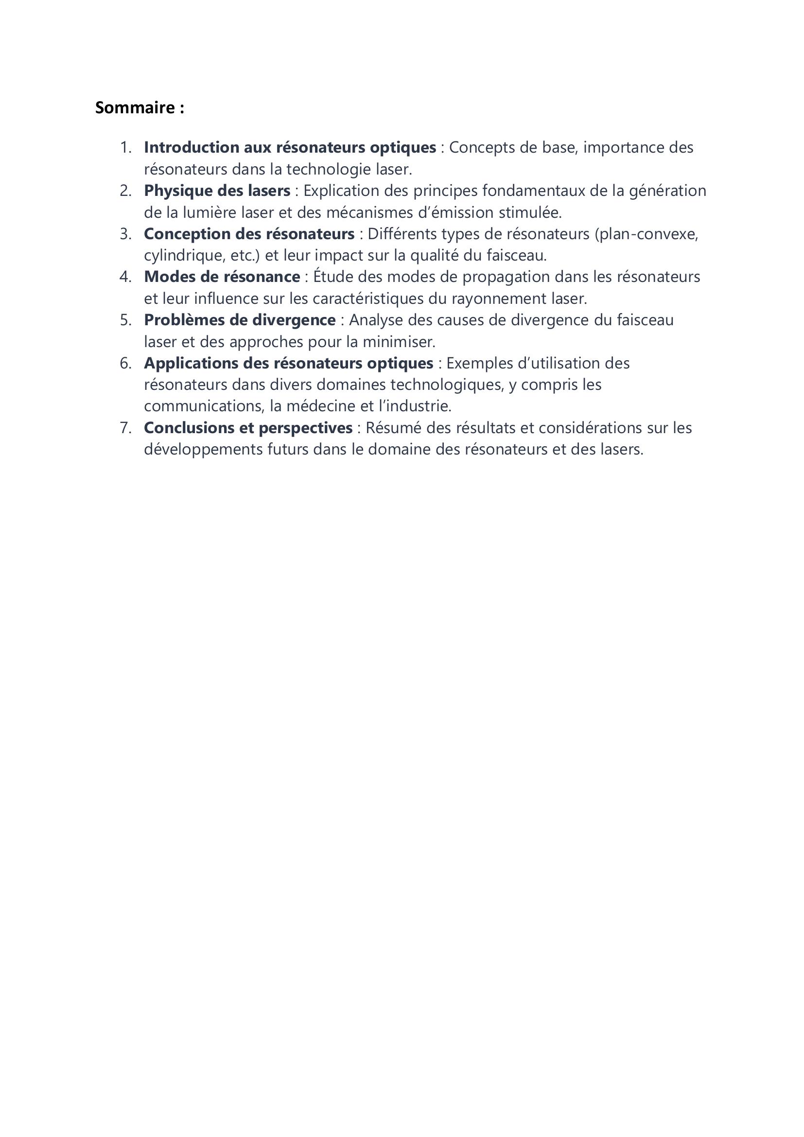 Cet ouvrage constitue une étude approfondie de la relation entre les résonateurs optiques et les caractéristiques du rayonnement laser, tout en proposant des solutions à la problématique de la divergence, ce qui est crucial pour l’optimisation des performances des lasers dans diverses applications technologiques.