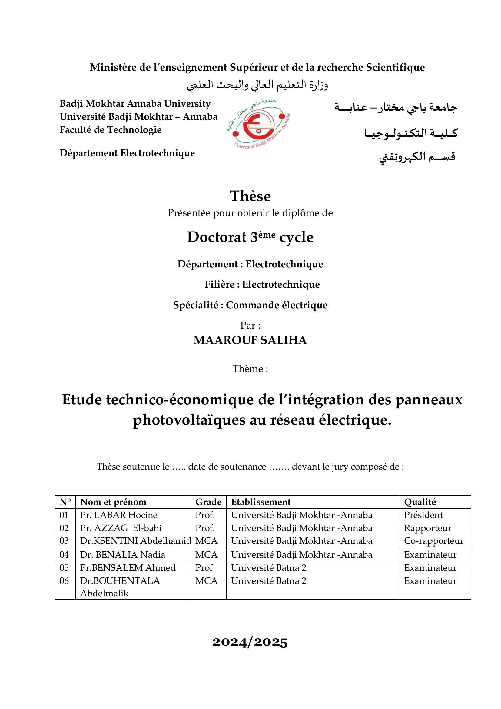 Cette recherche propose une analyse technico-économique visant à intégrer des panneaux photovoltaïques dans un réseau électrique. L’objectif majeur est d’améliorer les performances des systèmes photovoltaïques raccordés au réseau en évaluant cinq algorithmes de contrôle : P&O, INC, PSO, SMC et BACK, dans des conditions climatiques diverses. La démarche initiale a consisté en une analyse approfondie des avancées contemporaines dans le domaine des énergies renouvelables, avec une attention particulière portée à l’essor de l’énergie solaire photovoltaïque en Algérie. Par la suite, une présentation détaillée des diverses topologies des systèmes photovoltaïques raccordés au réseau a été effectuée. Un modèle analytique élaboré a été développé, intégrant des simulations précises de cellules et de modules photovoltaïques, afin d’examiner les caractéristiques I(V) et P(V) sous des conditions climatiques variées, y compris en cas d’ombrage partiel. En outre, une investigation exhaustive des stratégies d’optimisation du point de puissance maximale (MPPT) a été conduite, en s’appuyant sur des critères rigoureux d’évaluation des performances pour identifier la méthode la plus efficiente. Les simulations réalisées via Matlab/Simulink ont révélé que l’algorithme BACK se distinguait par une supériorité notable en termes de performance. Enfin, une analyse approfondie des dimensions techniques et économiques des installations photovoltaïques intégrées au réseau a été effectuée à l’aide du logiciel PVsyst.