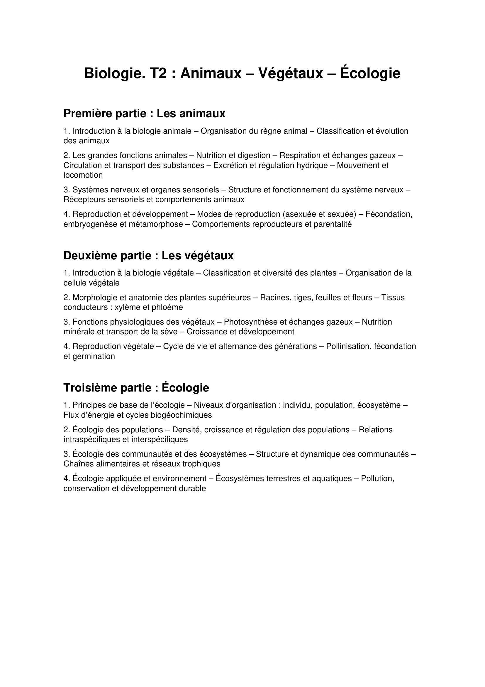 Ce volume aborde les grandes fonctions vitales des organismes animaux et végétaux, ainsi que leurs structures et modes de reproduction. Il met en évidence les principes d’organisation des êtres vivants, leurs interactions au sein des écosystèmes et les mécanismes de régulation qui assurent l’équilibre des milieux naturels. L’ouvrage présente également les fondements de l’écologie, notamment les relations trophiques, les cycles biogéochimiques et les dynamiques des populations. Enfin, il souligne l’importance de la biodiversité et les conséquences des activités humaines sur les équilibres écologiques.