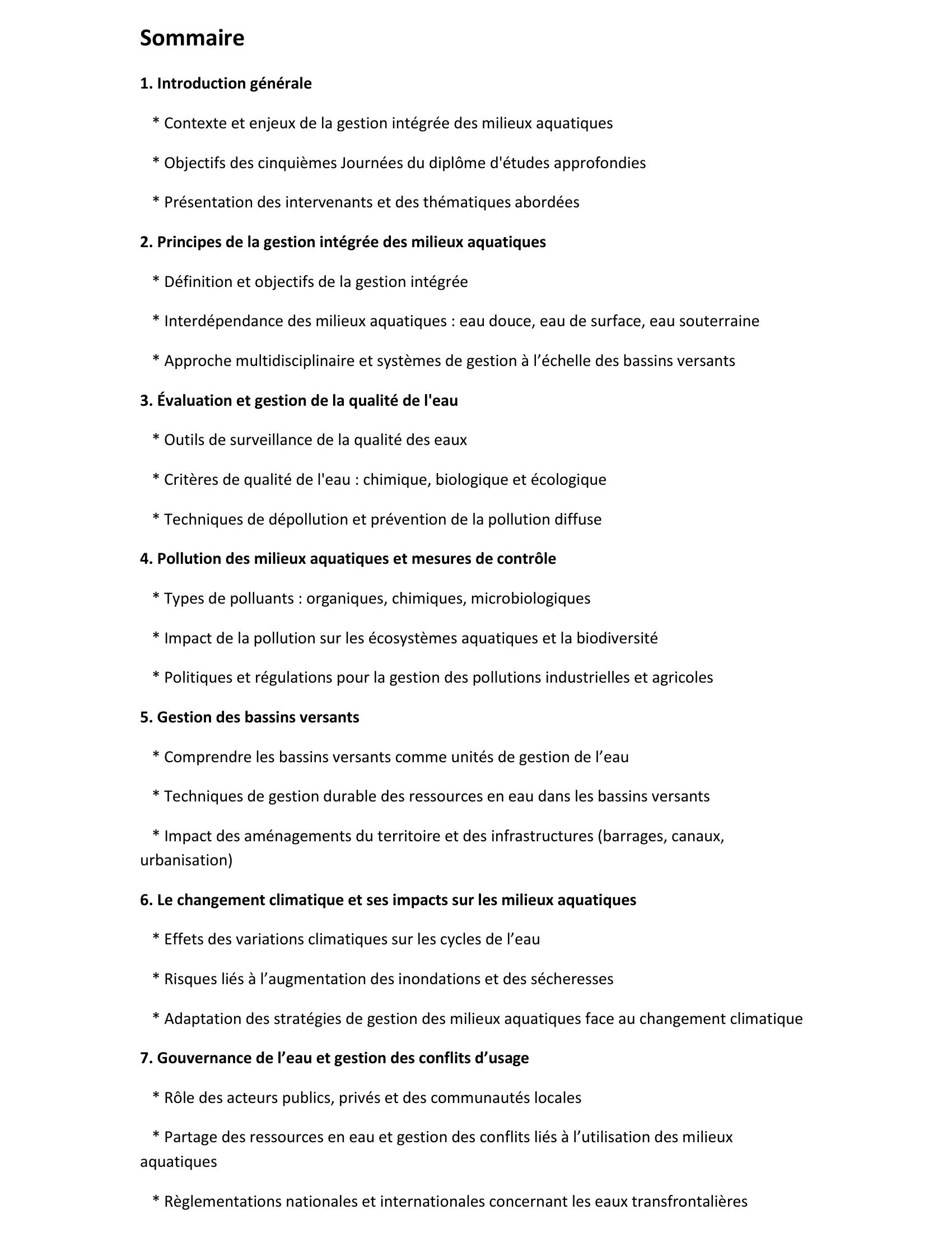 Cet ouvrage rassemble les contributions scientifiques des cinquièmes Journées du diplôme d'études approfondies en Sciences et Techniques de l’Environnement, dont le thème principal est la gestion intégrée des milieux aquatiques. Les intervenants ont abordé divers aspects de la gestion des ressources en eau, en soulignant la nécessité d’une approche globale et multidisciplinaire. Ce type de gestion inclut l'analyse des interactions entre les différents types de milieux aquatiques (rivières, lacs, zones humides, nappes souterraines) et l'impact des activités humaines sur leur qualité et leur pérennité. Les discussions ont porté sur la gestion des bassins versants, la prévention de la pollution des eaux, l'impact du changement climatique sur les hydrosystèmes, et la gouvernance de l'eau à différentes échelles (locale, nationale, internationale). Le rôle des acteurs publics et privés dans la gestion des ressources en eau a également été exploré, ainsi que les outils de planification et de suivi permettant une gestion durable des écosystèmes aquatiques. Enfin, les participants ont échangé sur les défis futurs, notamment face à l’urbanisation croissante, à la surconsommation des ressources en eau et aux phénomènes climatiques extrêmes.