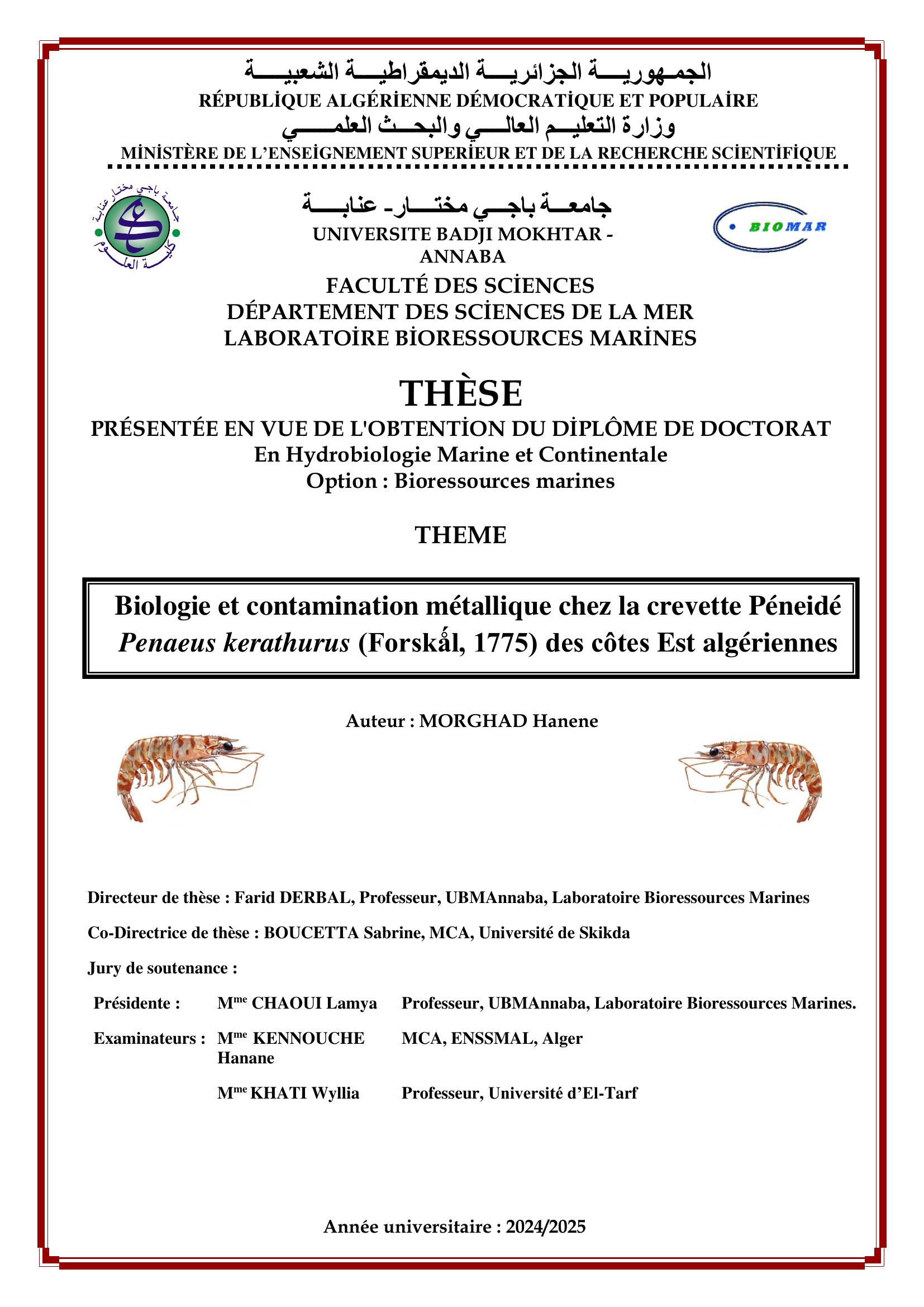 Biologie et contamination métallique chez la crevette Péneidé Penaeus kerathurus (Forskǻl, 1775) des côtes Est algériennes