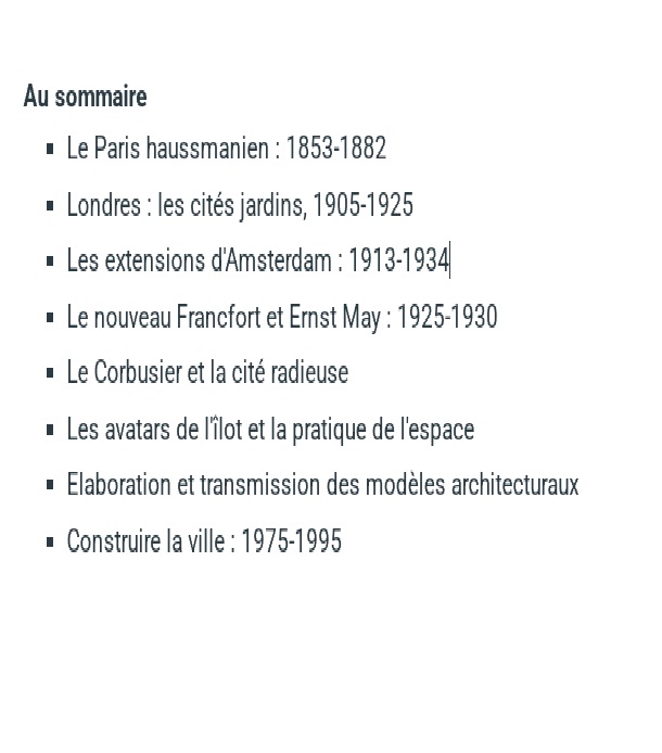 L'urbanisme moderne a bouleversé la forme des villes, aboli la rue, dissocié les bâtiments . En observant les étapes de cette transformation, ce livre affirme un point de vue : l'importance du tissu urbain, c'est-à-dire de cette échelle intermédiaire entre l'architecture des bâtiments et les grands tracés de l'urbanisme, qui est le cadre de la vie quotidienne. C'est en interrogeant le tissu urbain que l'on peut tenter de comprendre les relations complexes entre sol et bâti, entre voiries et constructions, entre formes et pratiques. Le parcours choisi - Paris , Londres , Amsterdam , Francfort - qui s'achève sur des exemples de la modernité la plus radicale, marque les jalons d'une histoire qui a, en un siècle (1860-1960), bouleversé le visage des villes et transformé notre cadre de vie . La secousse a été telle que nous en sommes encore à rechercher des solutions, à tenter de retrouver des formes urbaines conciliant la prise en compte des modes de vies actuels et le maintien ou la poursuite des dispositions traditionnelles. L'îlot comme organisation spatiale a parfois pu apparaître comme le garant facile d'une urbanité retrouvée. L'analyse de son éclatement devrait inciter à plus de précaution. La lecture renouvelée des débats qui ont jalonné sa transformation ouvre de nouvelles perspectives.