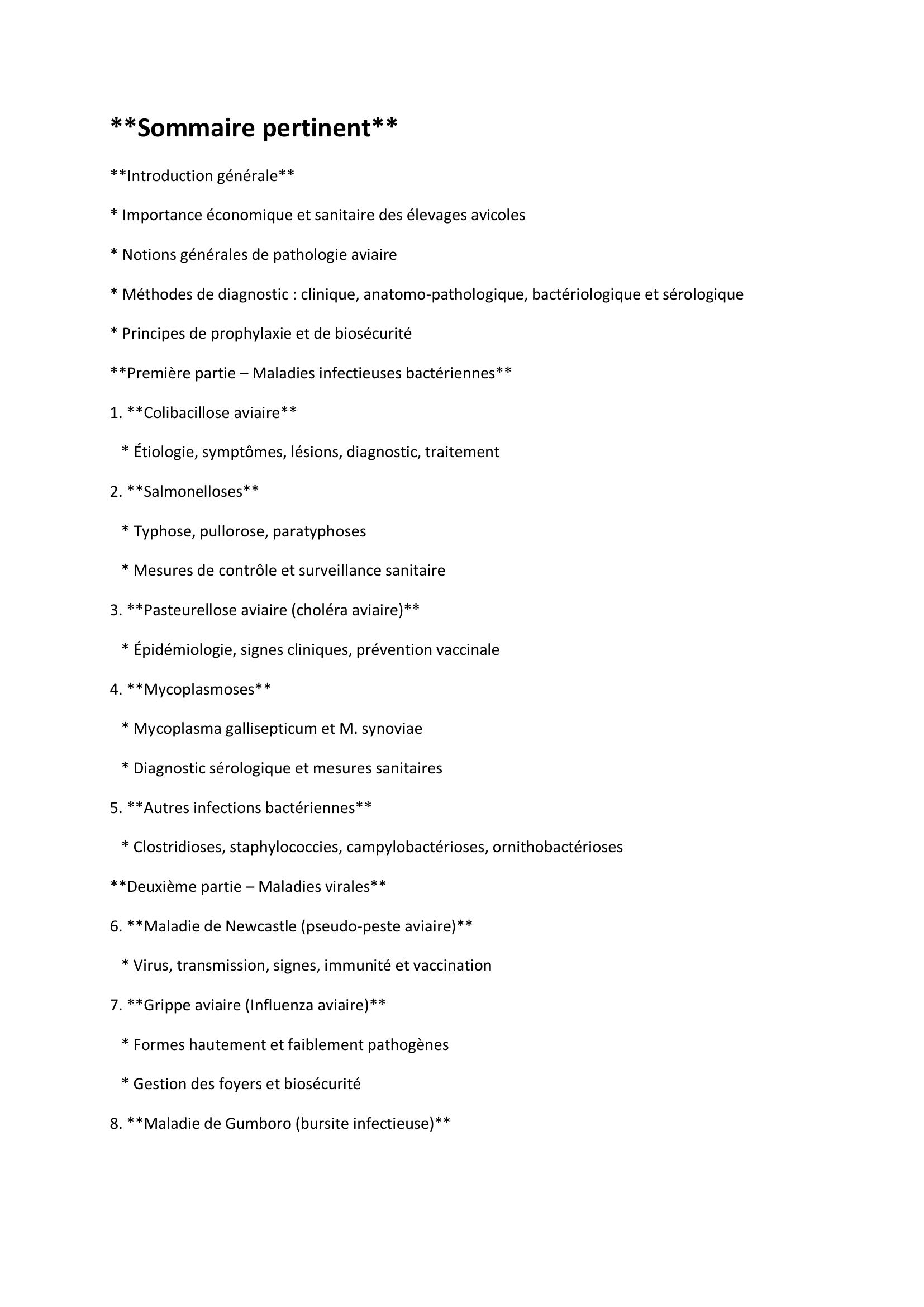 Cet ouvrage a été conçu à partir d’enquêtes sur les différentes pathologies aviaires présentes sur le terrain depuis une dizaine d'années.les maladies virales,bactériennes,parasitaires et nutritionnelles les plus fréquentes ainsi que d'autres troubles pathologiques occasionnels sont décrits de façon exhaustive.l'analyse des caractères épidémiologiques la présentation des symptômes et des lésions sous formes d'illustration et la proposition de prophylaxies et de traitements judicieux permettent un diagnostique clinique précoce et une gestion efficace de ces états pathologiques.ce manuel est destiné aux étudiants de 5éme année vétérinaire comme support pédagogique de cours et de clinique de pathologie aviaire ainsi qu'au vétérinaires praticiens pour leur servir de guide de diagnostique