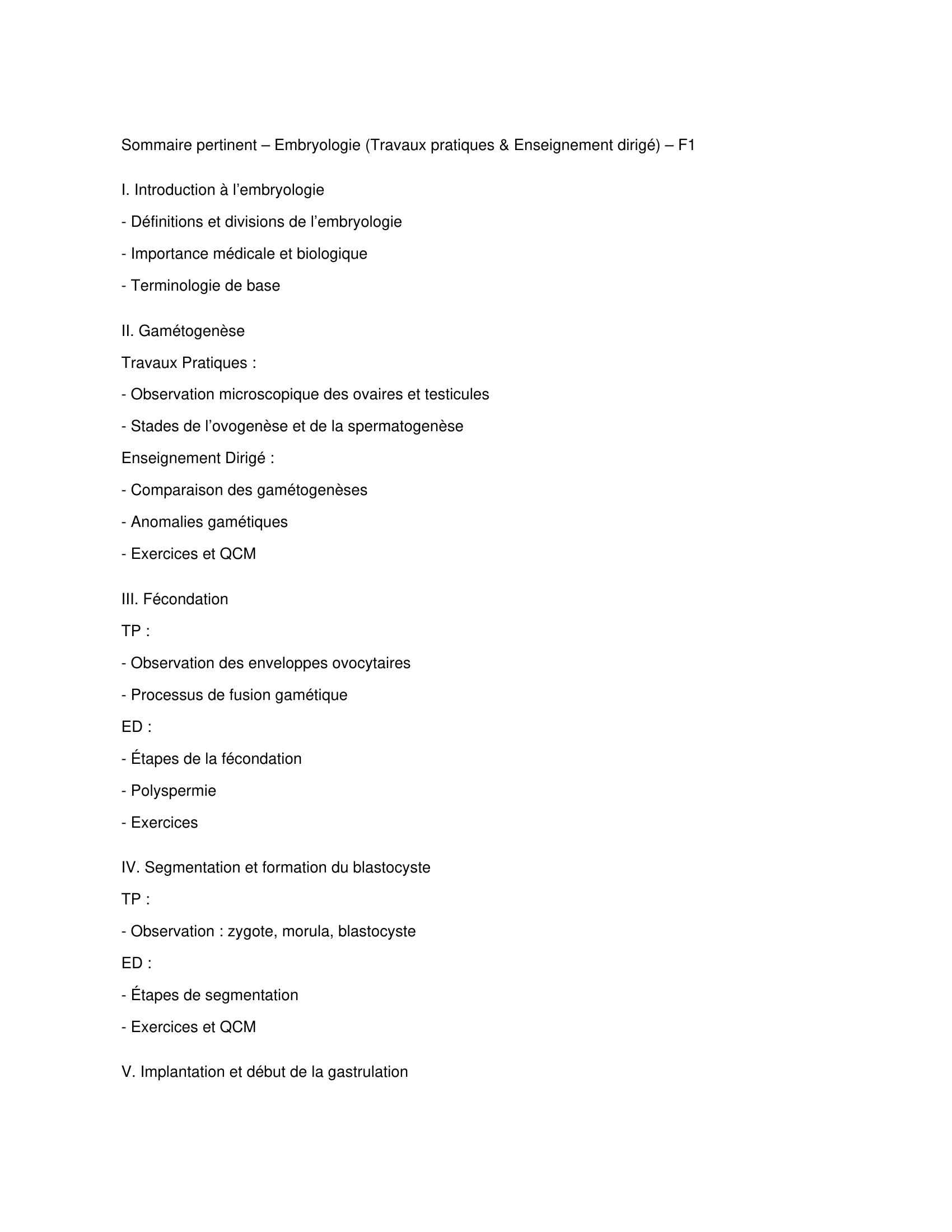 Embryologie, travaux pratiques et enseignement dirigé. F1