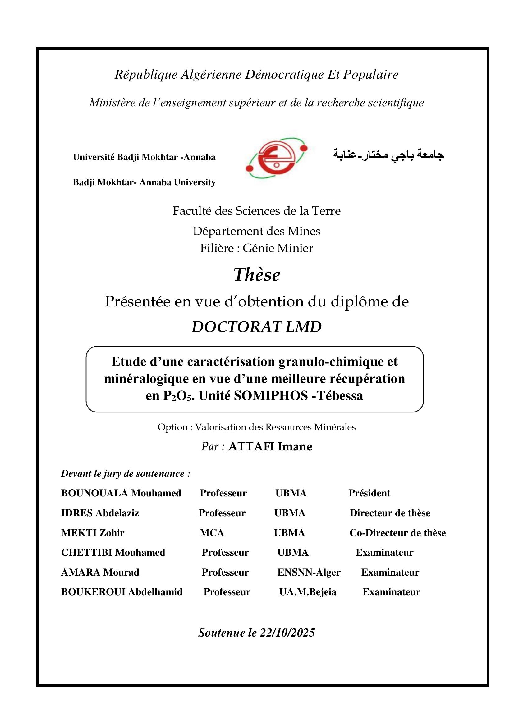 Le phosphate est l'un des minéraux les plus utilisés et les plus recherchés au monde, en raison de son importance, particulièrement dans l’agriculture, il est un élément nutritif très nécessaire. Actuellement en Algérie La wilaya de Tébessa renferme tous les gisements de phosphate, répartis sur quatre zones d'exploitation minière. Cette étude de recherche se concentre sur le gisement Kef Essenoun, qui s'étend sur près de 250 hectares et possède des réserves estimées à 2 milliards de tonnes, avec deux types distincts. L'un est beige et se divise en trois sous- couches (basale, principale, sommitale), alors que l'autre est noir et se subdivise en deux sous-couches (principale et sommitale). Les phosphates algériens sont caractérisés par les apatites comme des minéraux utiles et la dolomite, quartz, matière organiques comme des minéraux inutiles. Le traitement des phosphates beiges et noirs au niveau du complexe minier de Djebel Onk ne concerne actuellement que les sous-couches principales ; les autres sous-couches étant considérées comme des stériles et stockées à proximité du complexe. L’analyse chimique de ces sous couches montre qu’elles renferment des teneurs en phosphate assez élevés arrivant à 27.78% dans la sous-couche basale du phosphate beige, et à 18.44% et 19.57% pour les sous-couches sommitales beige et noir respectivement. Le stockage de ces sous couches pose un défi pour l’entreprise, à cet effet l'objectif de cette étude est d'analyser et de traiter ces stocks toute en utilisant un mélange de trois sous- couches de phosphate beige et un autre mélange de deux sous-couches de phosphate noir comme des fractions d'alimentation de la chaine de traitement.Afin d’atteindre cet objectif, une série d’opérations de préparation des échantillons et de caractérisation a été effectuée. Cette caractérisation comprend une étude pétrographique, des analyses granulo-chimiques, DRX, MEB/EDS, SAA, AA, calcimètre Bernard. Ces analyses permettent d’une part d’identifier les phases minérales de manière quantitative et qualitative, et d’autre part de choisir un procédé combiné de traitement par calcination à 1000°C suivie d'une flottation inverse qui a donné des résultats satisfaisants. La teneur en P2O5 atteint 33,88 %, en MgO 1.26%, en CO2 3.67% pour le phosphate beige ; et 33,13% en P2O5, 1.33% en MgO, et 1.66% en CO2 pour le phosphate noir, tout en créant des nouveaux schémas de traitement pour le complexe.