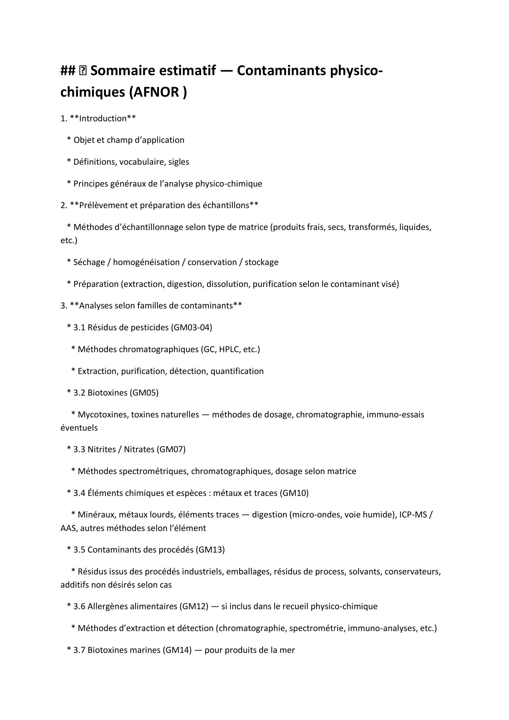 * Ce recueil appartient au cadre des « méthodes d’analyse horizontales des produits alimentaires » — classification AFNOR/V03B. * Il concerne l’ensemble des denrées alimentaires, tous secteurs de l’agroalimentaire. * Il définit des méthodes normalisées pour identifier, quantifier ou caractériser les contaminants physico-chimie-chimiques dans les aliments, dans une logique de sécurité sanitaire et de qualité.