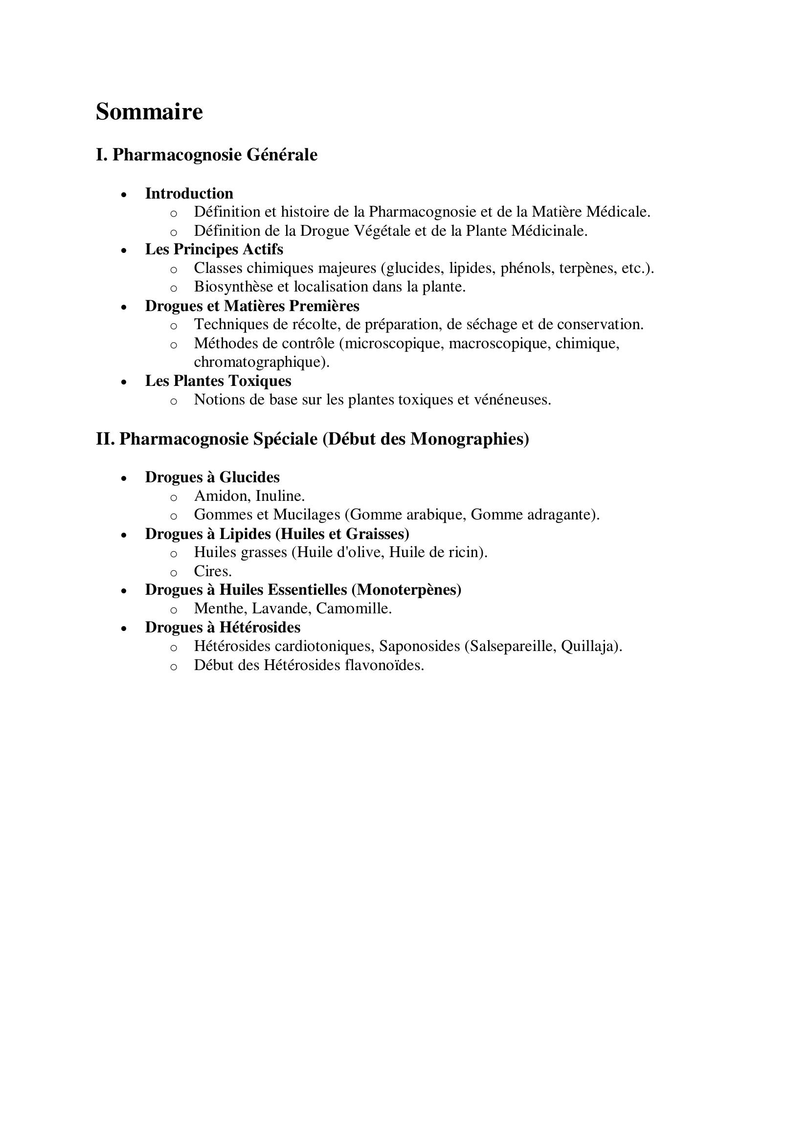 Cet ouvrage est un manuel didactique destiné aux étudiants en pharmacie. Il couvre les bases fondamentales de la pharmacognosie (l'étude des drogues d'origine naturelle, principalement végétale, utilisées à des fins thérapeutiques) et initie à la description monographique des plantes médicinales et des substances naturelles. Le Tome 1 est généralement structuré autour de deux grandes parties : Pharmacognosie Générale : Cette section introduit les concepts de base. Elle définit la matière médicale, la drogue végétale, la plante médicinale et ses différents constituants (les principes actifs). Elle aborde les méthodes d'obtention, d'identification, de contrôle de qualité et d'analyse des drogues naturelles. Elle peut aussi couvrir les grandes classes chimiques de principes actifs (glucides, lipides, hétérosides, etc.) Pharmacognosie Spéciale (Début) : Cette partie consiste en des monographies (descriptions détaillées) de drogues végétales spécifiques, classées en général selon leur nature chimique (par exemple, les plantes à glucides, à lipides, à huiles essentielles) ou leur classification botanique (par exemple, les Thallophytes, les Cryptogames vasculaires, les Phanérogames).