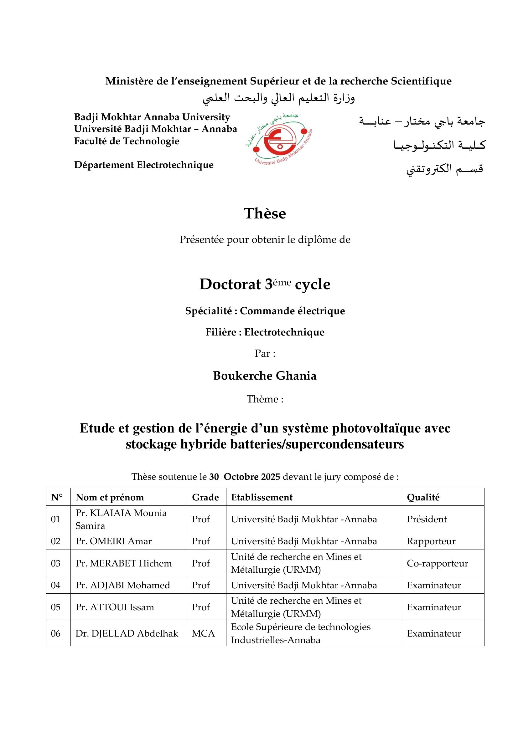 Avec le monde récemment exposé à un certain nombre de crises, telles que le changement climatique et les guerres en cours, La quantité d'énergie utilisée est en constante hausse, poussant les chercheurs à rechercher de nouvelles sources d’énergie. Ils ont adopté les énergies renouvelables pour avoir de nombreux avantages, tels qu'être une source économique et nette d'énergie durable. Ces énergies sont l’énergie solaire photovoltaïque et l’énergie éolienne, qui est considérée comme les énergies les plus bas. La génération d'énergie solaire dépend des conditions météorologiques (chaleur, rayonnement). Donc, en conséquence, la production d'énergie du système électrique varie selon les conditions météorologiques. Il est parfois élevé et parfois faible, ce qui a poussé les penseurs à développer un système pour stocker l’excès d’énergie et l’utiliser au besoin. Les recherches ne se sont pas arrêtées à cette étape, mais se sont concentrées sur la façon de maximiser l'efficacité du système photovoltaïque et sur la recherche du système le plus efficace pour stocker cette énergie, afin de localiser le point d'énergie idéal (MPPT), qui dépend de différentes façons, notamment des techniques traditionnelles et modernes basées sur l'intelligence artificielle. Pendant cette étude, nous avons analysé le processus de transformation en employant un dispositif de stockage d'énergie, tout en cherchant des techniques pour déterminer le point idéal. Nous avons proposé aussi une étude comparée de deux systèmes de stockage d'énergie. Dans le premier système, on recourt aux batteries (plomb-acide), tandis que le second système s’appuyait sur une accumulation composée d’une batterie et d’un supercondensateur. Nous avons obtenu des résultats qui confirment nos résultats théoriques et qui prouvent que le système photovoltaïque à la logique floue (MPPT) est supérieure aux méthodes classiques pour la stabilité, le temps de réaction, l'excès et le niveau d'écrasement, ce qui prouve que le stockage hybride est plus efficient et plus coûteux qu’un système de batterie.