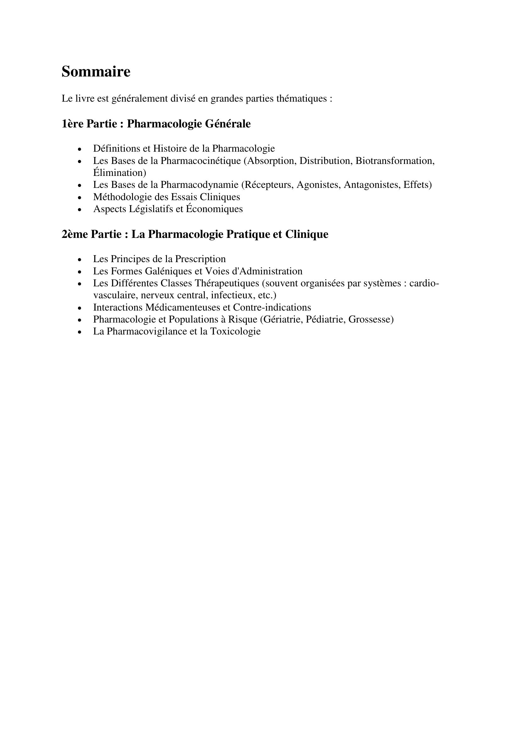 Cet ouvrage est un manuel didactique fondamental destiné aux étudiants en médecine, pharmacie et sciences de la santé, ainsi qu'aux professionnels de la santé. Il est structuré en deux grandes parties : la Pharmacologie générale et la Pharmacologie pratique, visant à établir un lien essentiel entre les mécanismes d'action des médicaments et leur utilisation clinique rationnelle.