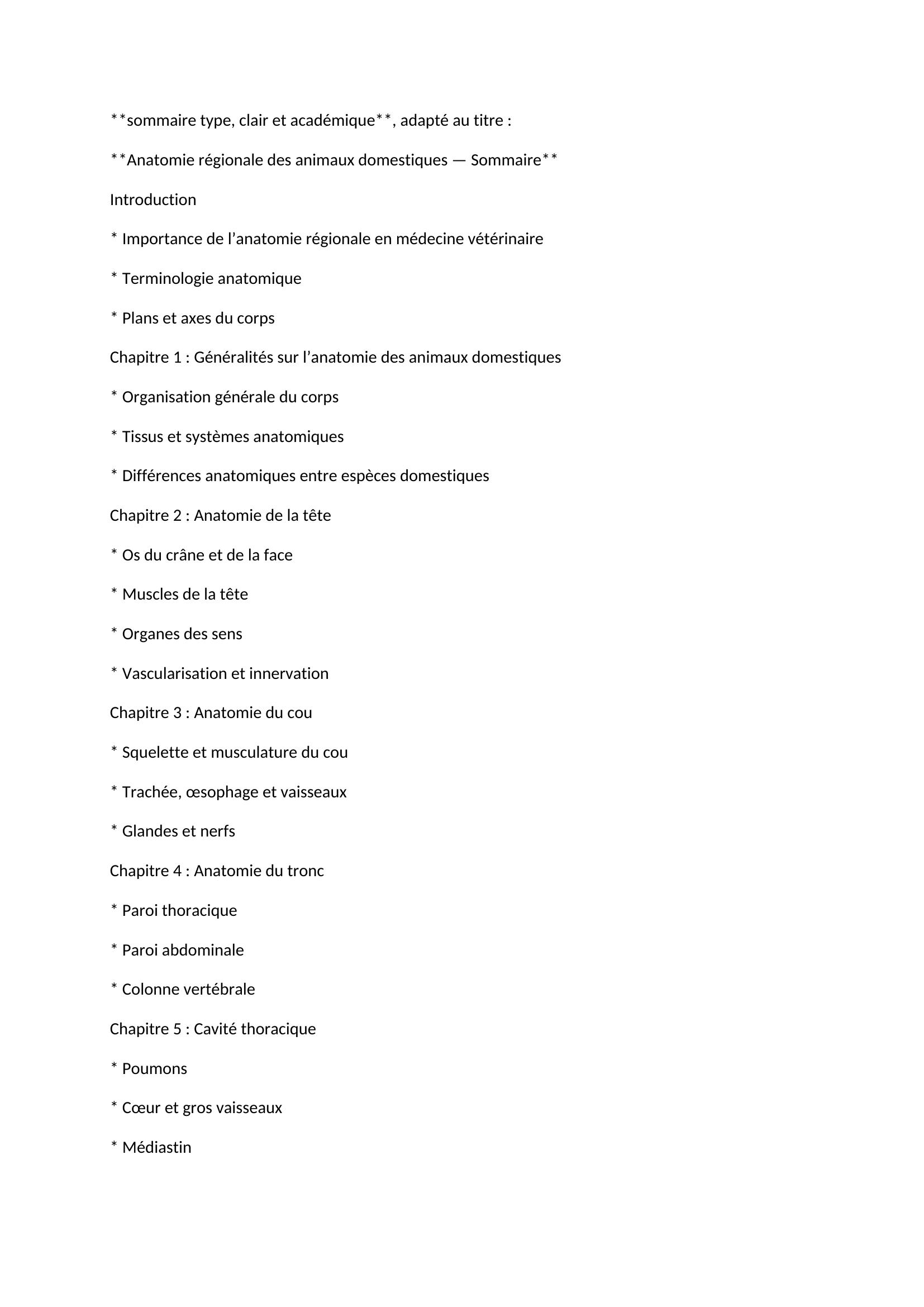Cet ouvrage traite de l’anatomie des animaux domestiques selon une approche régionale, en décrivant de manière méthodique les différentes parties du corps (tête, cou, tronc, membres, cavités thoracique et abdominale). Il présente l’organisation, la forme, la position et les rapports des organes, des muscles, des os, des vaisseaux et des nerfs dans chaque région anatomique.Le livre met l’accent sur les principales espèces domestiques (bovins, ovins, caprins, équins, porcins, carnivores domestiques), en soulignant les similarités et différences anatomiques entre elles. Cette approche facilite la compréhension des bases nécessaires à la médecine vétérinaire, à la zootechnie, à la chirurgie vétérinaire et à l’examen clinique.