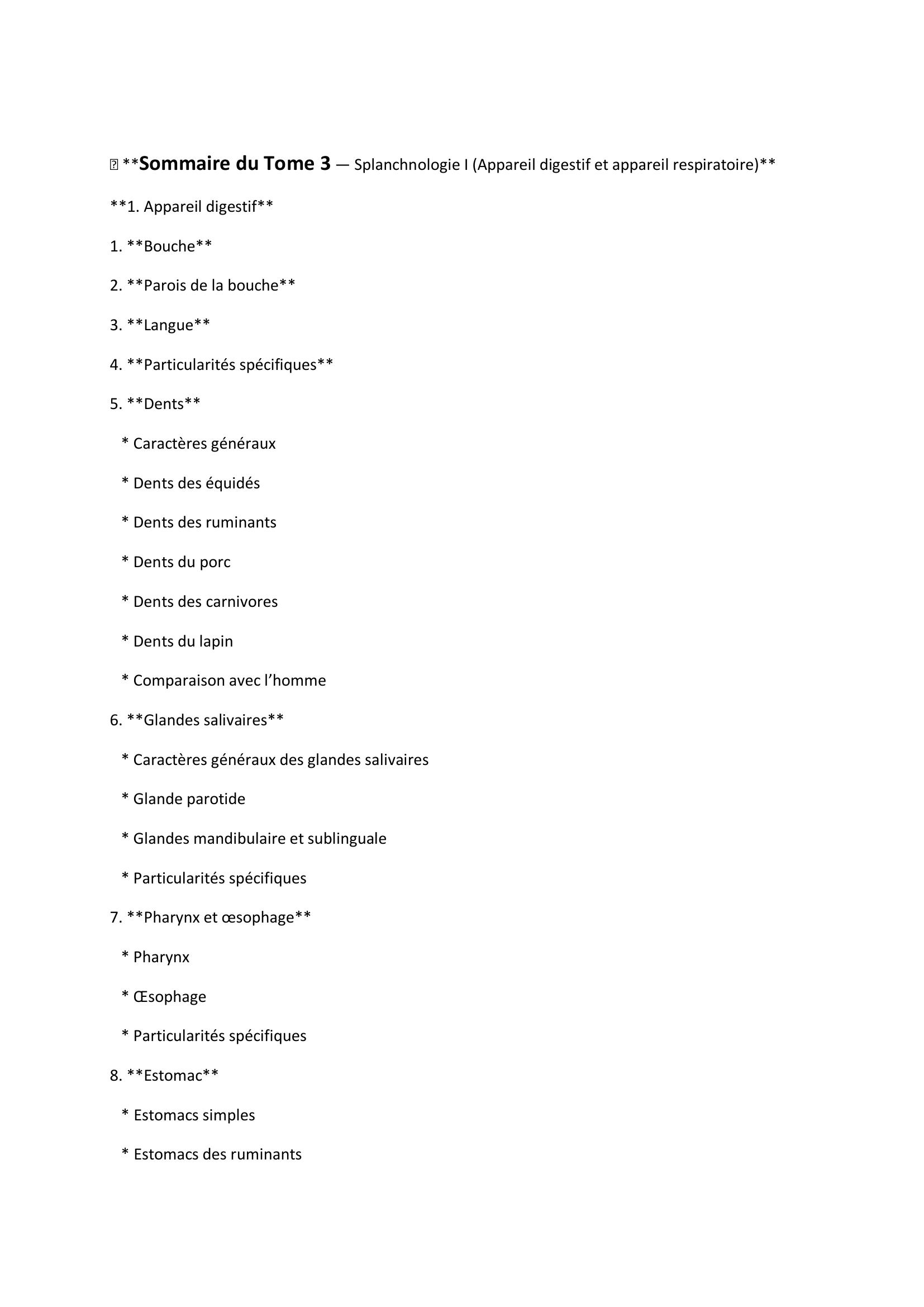 Ce tome étudie l’anatomie comparée des appareils digestif et respiratoire chez les mammifères domestiques (bovins, ovins, caprins, équins, porcins, carnivores). Pour l’appareil digestif, il décrit en détail : bouche, dents, langue, pharynx, œsophage, estomac (simples et ruminants), intestins, glandes annexes (foie, pancréas) et rate. Chaque organe est analysé de manière comparative, en mettant en évidence les particularités spécifiques à chaque espèce. Pour l’appareil respiratoire, le tome présente : cavités nasales, larynx, trachée, bronches, poumons et cavité thoracique, toujours avec une approche comparative. Le livre combine anatomie macroscopique et observations fonctionnelles, avec des illustrations détaillées pour faciliter la compréhension et la comparaison entre espèces. Ce tome est destiné aux étudiants en médecine vétérinaire, aux techniciens agricoles et aux chercheurs en anatomie animale, fournissant un support complet pour l’étude et la pratique vétérinaire. Si tu veux, je peux te faire un résumé encore plus court, genre 5 lignes, pour fiche de révision rapide. Veux‑tu que je fasse ça ?