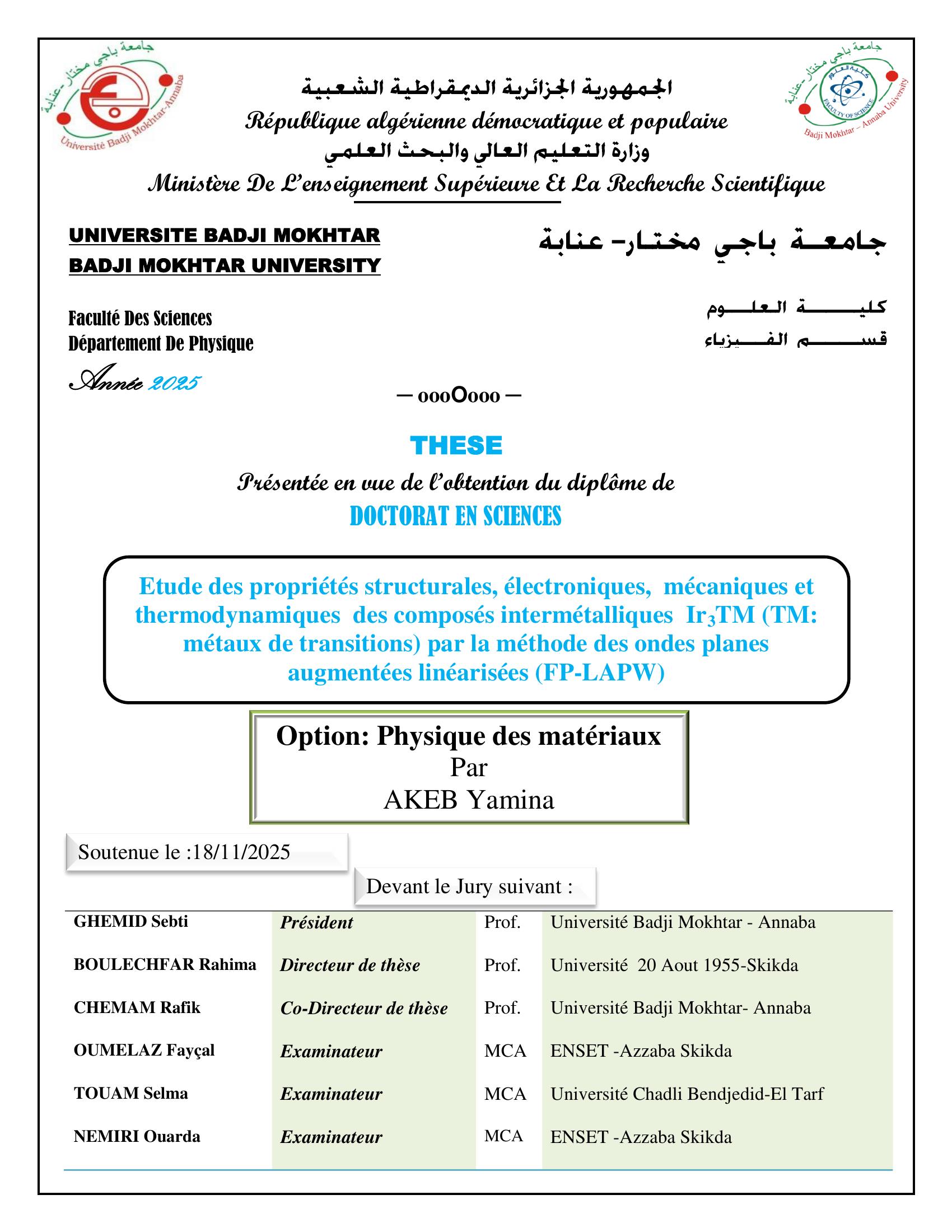 Dans cette thèse, les propriétés structurelles, mécaniques, électroniques et thermodynamiques des composés intermétalliques Ir3TM (TM = Sc, Ti et V) sont présentées dans les phases cubique (L12) et hexagonales (D019 et D024). Les simulations ont été réalisées en se basant sur la théorie de la fonctionnelle de densité (DFT), en utilisant l'approche de l'onde plane augmentée linéarisée (FP- LAPW) ainsi que l'approximation du gradient généralisé de Perdew-Burke-Ernzerhof (PBE-GGA). Cette étude a été réalisée pour la phase cubique L12, ainsi que les phases hexagonales D024 et D019, qui peuvent être apparentées mais diffèrent par la manière dont les couches atomiques sont empilées. Les énergies totales, cohésives et de formation calculées suggèrent que le composé Ir3Sc pourrait être stable en phase D024, en raison d'un chevauchement avec la phase L12, présentant une différence d'énergie totale d'environ 0,026 eV/atome. Ir3Ti et Ir3V sont plus stables dans les phases L12 et D019 respectivement. Les résultats des calculs relatifs aux constantes élastiques montrent que les composés étudiés présentent une stabilité mécanique et une dureté supérieure dans la phase cubique par rapport à la phase hexagonale. Cependant, Ir3Sc présente la dureté la plus faible en raison de sa relative ductilité, alors qu'Ir3V possède la dureté maximale avec une moindre ductilité. Ces composés montrent une anisotropie élastique, basée sur la surface du module de Young tridimensionnel, Ir3Sc ayant la plus forte anisotropie et Ir3V la plus faible dans la phase L12. Les calculs de la densité totale d’états (TDOS) révèlent qu'Ir3Ti et Ir3V sont stables dans les phases L12 et D019 respectivement, à l'exception du composé Ir3Sc, qui pourrait subir une transition martensitique. De plus, le pseudogap pour Ir3V se rapproche du niveau de Fermi, indiquant que la liaison covalente dans ce composé est plus marquée que dans les autres. Par ailleurs, les propriétés thermodynamiques sont étudiées et évaluées en fonction des variations de température et de pression, en employant le modèle quasi- harmonique de Debye implémenté dans le programme de calcul Gibbs.