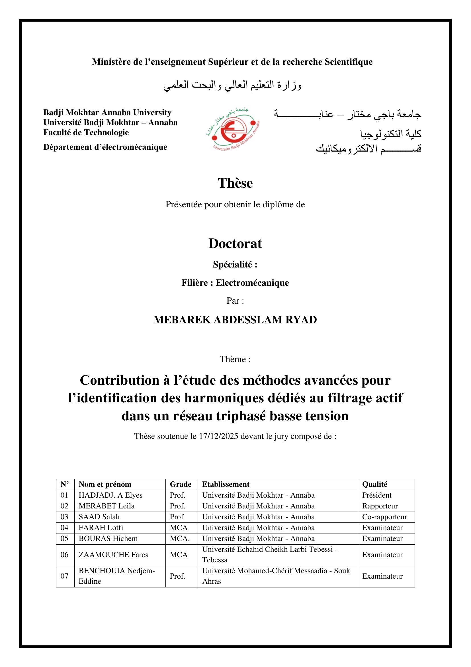 La prolifération croissante des charges non linéaires dans les réseaux électriques modernes engendre une pollution harmonique significative, compromettant la qualité de l’énergie. Parmi les solutions envisagées, le filtrage actif de puissance se distingue comme l’une des méthodes les plus performantes et les mieux adaptées aux exigences actuelles. Cette thèse s’inscrit dans ce contexte et propose une contribution originale en développant de nouvelles stratégies de commande pour les filtres actifs parallèles à quatre bras, spécifiquement conçus pour les réseaux triphasés à quatre fils (avec neutre). L’objectif principal est d’assurer une compensation globale et simultanée des harmoniques, du courant de neutre, de la puissance réactive ainsi que du déséquilibre du réseau, en s’appuyant sur des techniques intelligentes. Les travaux portent particulièrement sur l’identification précise des composantes perturbatrices à l’aide d’approches neuronales fondées sur l’architecture ADALINE (ADAptive LINear Element), entraînée par l’algorithme LMS (Least Mean Square). Deux méthodes innovantes sont introduites : la détection synchrone neuronale et la théorie p–q–r neuronale, toutes deux comparées à des approches neuronales classiques telles que la méthode ADALINE Direct et la méthode des courants actifs. Les différentes stratégies proposées ont été rigoureusement évaluées par des simulations sous MATLAB/Simulink. Les résultats obtenus mettent en évidence la supériorité des approches développées, tant en termes de précision d’identification que d’efficacité dans la réduction des harmoniques, avec des taux de distorsion harmonique totale (THD) conformes, voire inférieurs, aux seuils fixés par la norme IEEE 519.