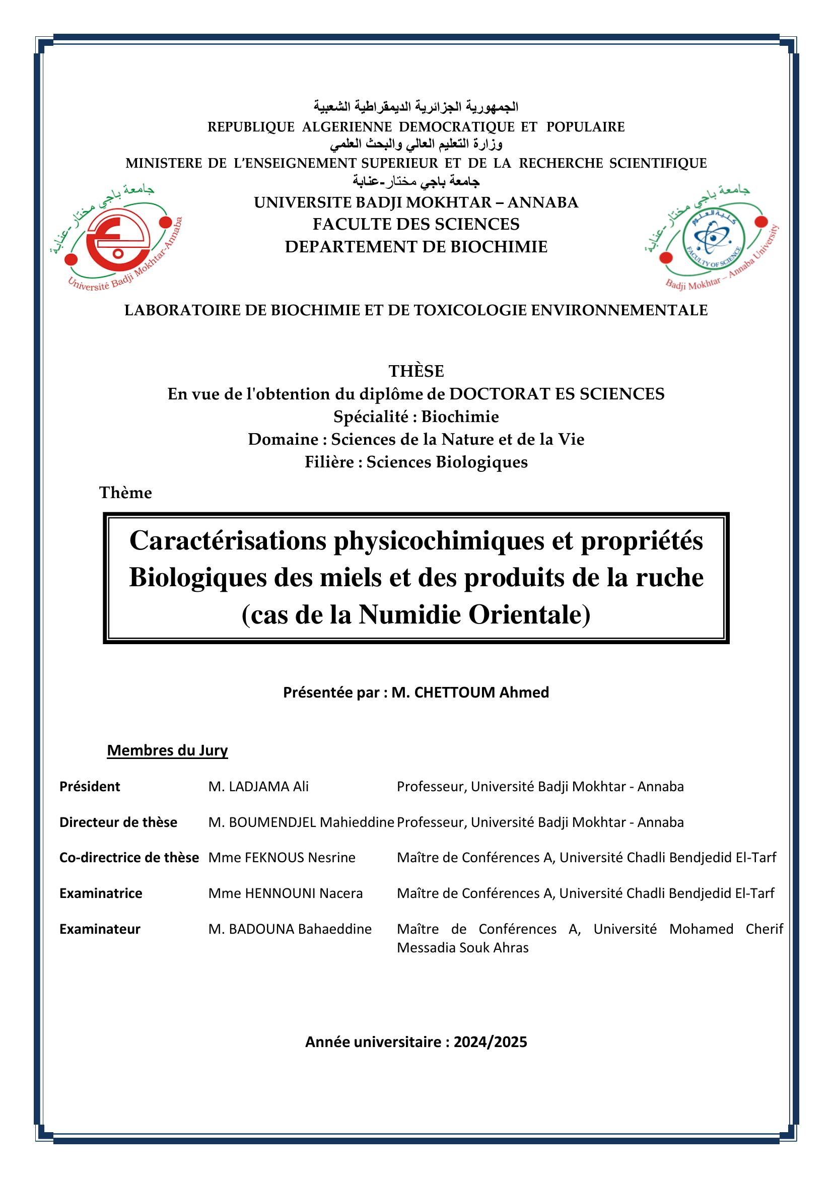 Caractérisations physicochimiques et propriétés biologiques des miels et des produits de la ruche (cas de la numidie orientale)