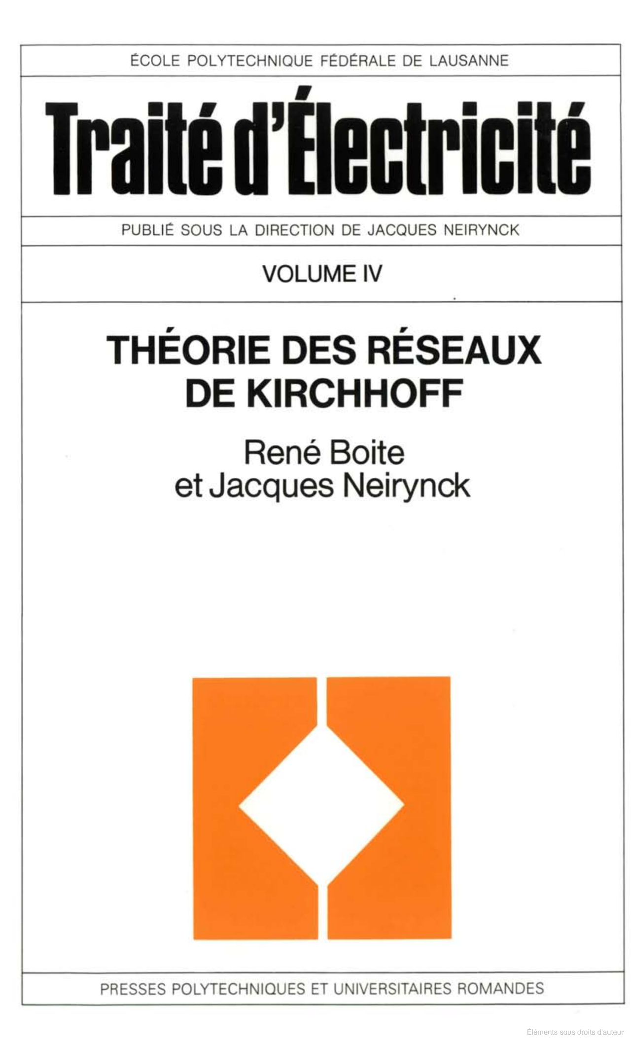 Le Traité d’électricité, Volume IV : Théorie des réseaux de Kirchhoff de René Boite (1996) est un ouvrage fondamental sur l’analyse des réseaux électriques et de leurs analogues physiques, fondé sur les lois de Kirchhoff. Il propose une approche rigoureuse pour modéliser et étudier les réseaux en utilisant des outils mathématiques modernes, comme les équations différentielles, les matrices, et les transformées de Laplace et de Fourier. Le livre présente d’abord les concepts de base des réseaux, les notions de nœuds et de mailles, puis explore l’analyse des circuits élémentaires et des quadripôles. Il insiste sur les propriétés générales des systèmes linéaires, telles que la réciprocité, la dualité et la stabilité, tout en montrant comment les méthodes peuvent s’appliquer à des systèmes mécaniques ou acoustiques analogues. Destiné aux étudiants avancés en génie électrique et aux ingénieurs, ce volume fournit un cadre théorique complet pour comprendre, analyser et résoudre les réseaux complexes, en reliant les principes fondamentaux aux techniques analytiques modernes.