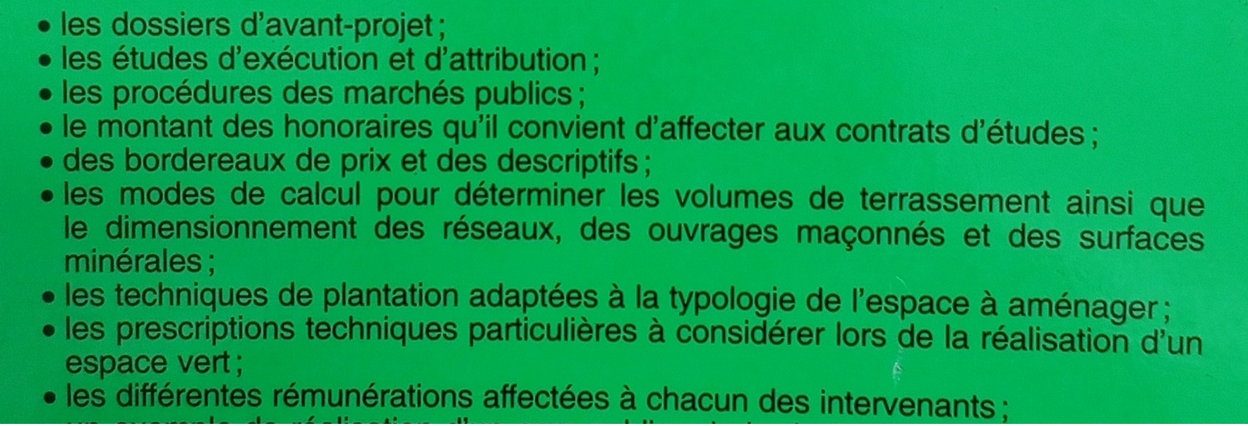 il n'existait jusqu'alors aucun livre permettant de mener de bout en bout une opération d'espaces verts, depuis la conception technique jusqu'à la réalisation définitive. Avec plus de 250 illustrations, 120 tableaux et les quelque 500 entrées de son index, cet ouvrage rassemble de façon cohérente une somme impressionnante d'informations techniques essentielles (horticulture, engazonnement, maçonnerie des jardins, surfaces minérales, réseaux...) Cet ouvrage est l'outil indispensable pour les directions départementales de l'Équipement, les collectivités territoriales et locales, les gestionnaires des parcs et jardins, les entreprises d'espaces verts, les techniciens d'études et de travaux, les bureaux d'études et les entreprises de VRD, et bien entendu, les paysagistes, les urbanistes et les architectes.