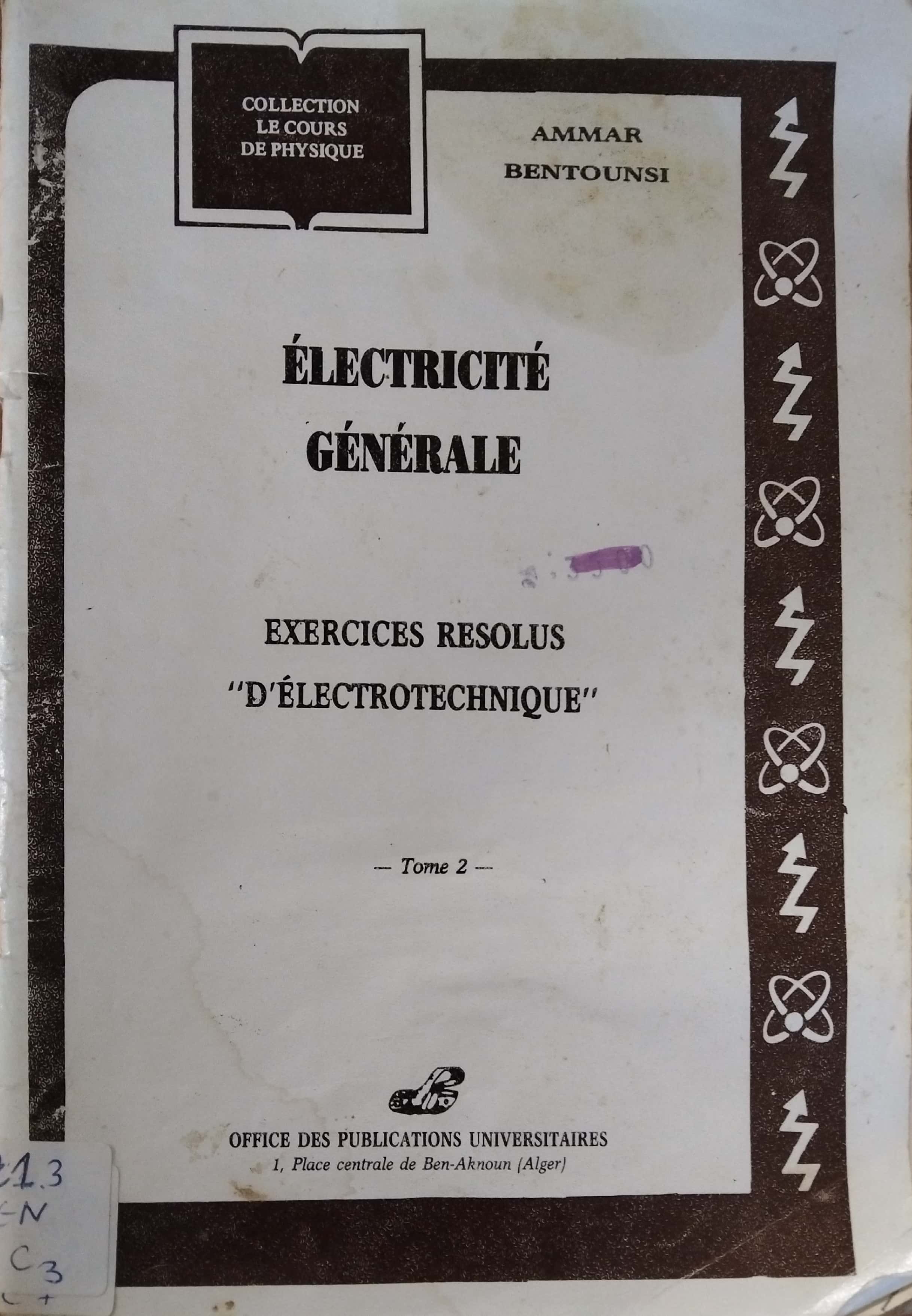 Le livre Électricité générale, Tome 2 : Exercices résolus d’électrotechnique d’Ammar Bentounsi (1992) est un ouvrage pédagogique destiné principalement aux étudiants en génie électrique et en électrotechnique. Il complète le cours théorique par une série d’exercices corrigés permettant d’appliquer concrètement les lois fondamentales de l’électricité. Le livre traite notamment de l’analyse des circuits en courant continu et en courant alternatif, des lois d’Ohm et de Kirchhoff, des puissances électriques, des impédances, ainsi que des circuits comportant des résistances, bobines et condensateurs. Grâce à des solutions détaillées et progressives, l’ouvrage aide l’étudiant à comprendre les méthodes de calcul, à développer un raisonnement rigoureux et à acquérir une maîtrise pratique des problèmes électriques courants. Il constitue ainsi un support efficace pour l’apprentissage, la révision et la préparation aux examens en électrotechnique.