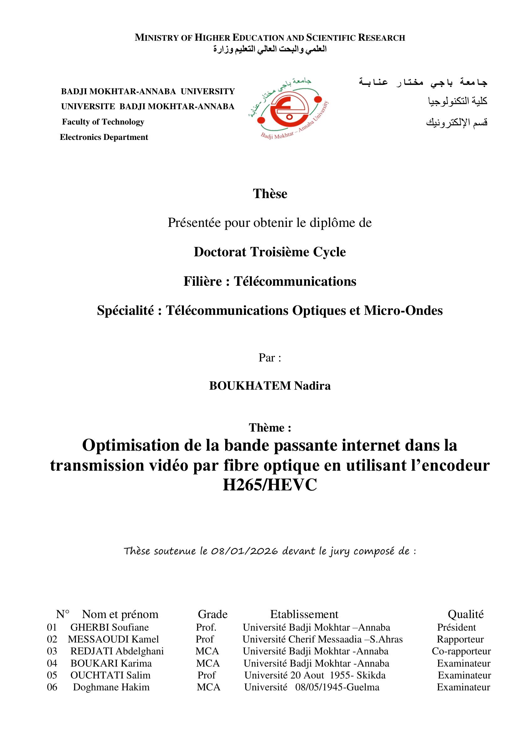 Cette thèse aborde la problématique de l'optimisation de la transmission de flux vidéo encodés en H.265/HEVC via la fibre optique, en soutenant que les méthodes optimisant séparément la compression et la transmission ne sont pas idéales en raison des interactions complexes entre les paramètres de l'encodeur HEVC et les caractéristiques du canal optique. L'objectif primordial était d'étudier cette interaction et de montrer, par simulation, les bénéfices d'une optimisation conjointe source-canal. On a opté pour une approche progressive en deux phases. Premièrement, une stratégie d'optimisation conjointe a été envisagée en perfectionnant l'intra-prédiction HEVC (via Matlab) et en l'associant à un système de transmission optique performant basé sur OTDM et la modulation DPSK (simulé sous OptiSystem). En second lieu, une analyse fondamentale a mis en évidence l'influence du paramètre CRF de HEVC sur le compromis débit/qualité et les limitations (distance, dispersion, atténuation) d'une liaison optique simple, confirmant la nécessité d'une approche intégrée. Les résultats de simulation ont démontré que l'optimisation préalable du flux vidéo HEVC améliorait significativement les performances (facteur de qualité, taux d'erreur binaire) de la transmission optique OTDM-DPSK comparativement à un flux non optimisé. Ainsi, La contribution majeure de cette thèse réside, dans la démonstration par simulation de la supériorité de l'approche d'optimisation conjointe pour améliorer l'efficacité spectrale et la fiabilité de la transmission vidéo HEVC sur fibre optique. Bien que limités à la simulation et à des aspects spécifiques de HEVC et des systèmes optiques, ces travaux soulignent la pertinence du co-design source-canal et ouvrent des perspectives pour le développement de systèmes de communication multimédia plus performants.