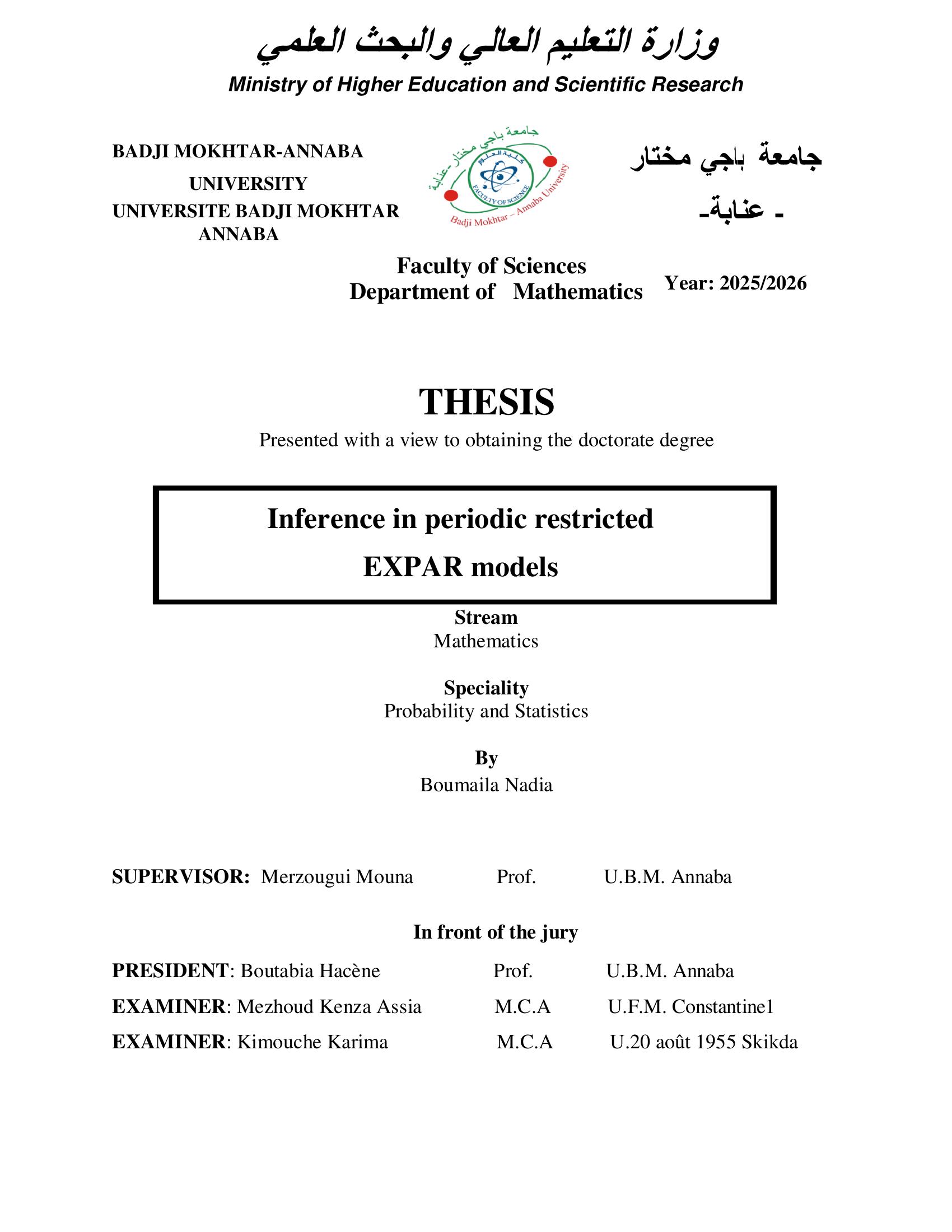 This thesis investigates the probabilistic and statistical properties of the periodic restricted exponential autoregressive (PEXPAR) process. By leveraging Markov chain theory, we establish conditions for strict periodic stationarity. Parameter estimation is performed using the quasi-maximum likelihood (QML) method, while model adequacy is assessed through Wald, Likelihood Ratio (LR) and Lagrange Multiplier (LM) tests to evaluate linearity and the nullity of final coefficients. Simulation studies support these findings by demonstrating the accuracy of the proposed tests in maintaining correct nominal levels and increasing power as the sample size grows, thereby validating the practical applicability of the methodology across various scenarios. In addition, we propose a recursive estimation algorithm for the restricted exponential autoregressive (EXPAR) model. This algorithm, based on the matrix inversion lemma, allows for efficient online estimation through Recursive Least Squares (RLS). It is shown that the RLS estimators are asymptotically efficient. A short simulation study highlights the excellent performance of the proposed estimators. Finally, we apply both periodic autoregressive (PAR) and PEXPAR models to precipitation time series data from Algeria, illustrating the practical relevance of our findings.